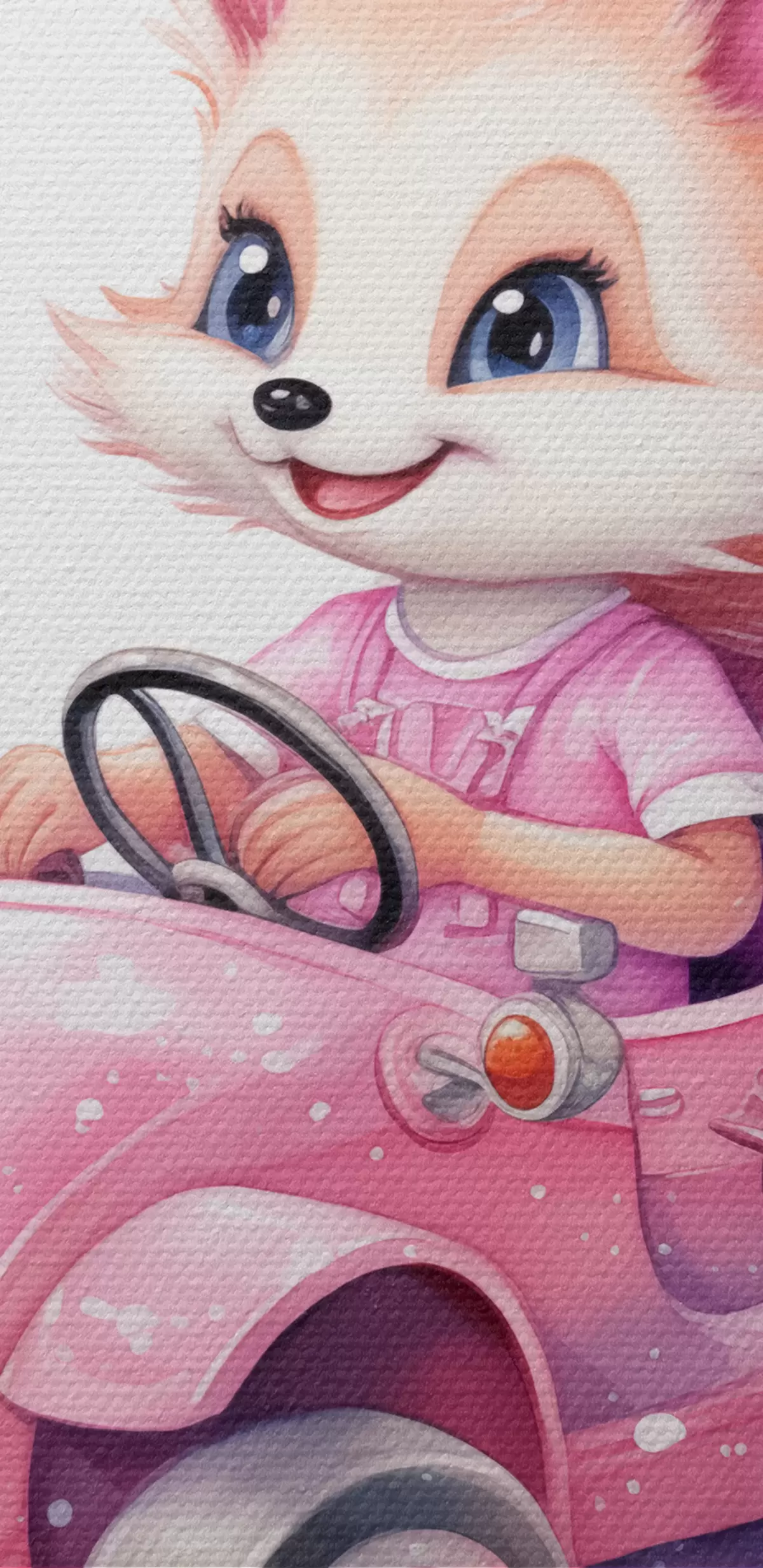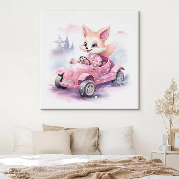 Cuadros Zorrito monta un coche rosa ilustración infantil en acuarela Nr s38943