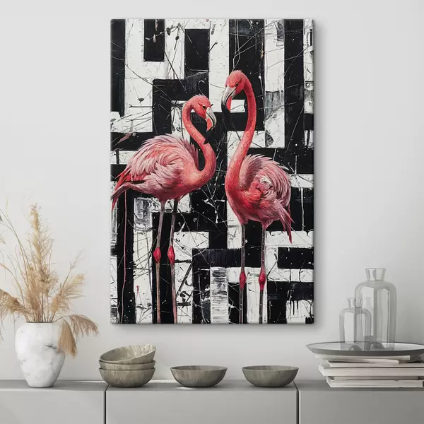 Cuadros Dos flamencos rosados parados frente a una pintura de arte de fondo abstracto en blanco y negro Nr s38954