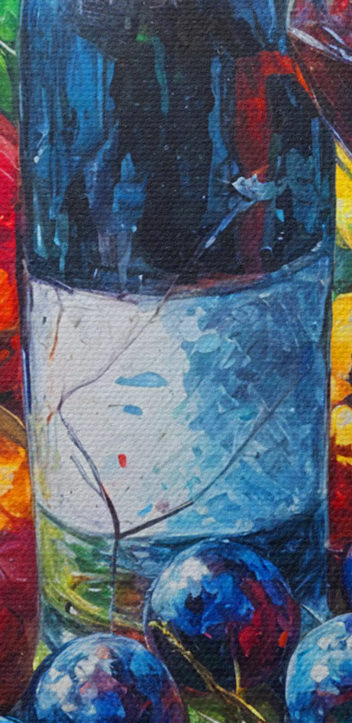 Cuadros Bodegón abstracto con una botella de vino, una copa de vino y frutas coloridas con toques de varios colores. Nr s38958