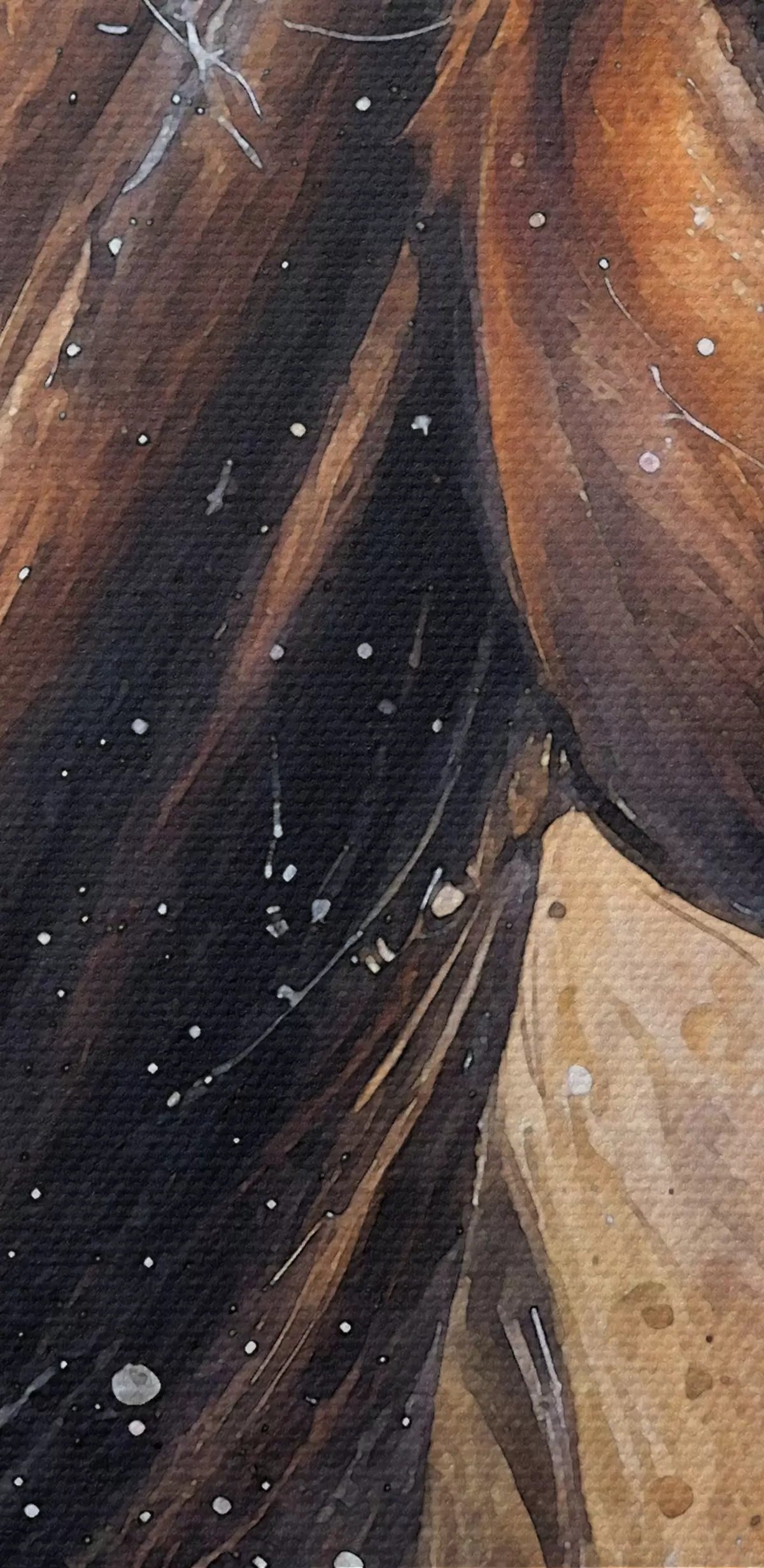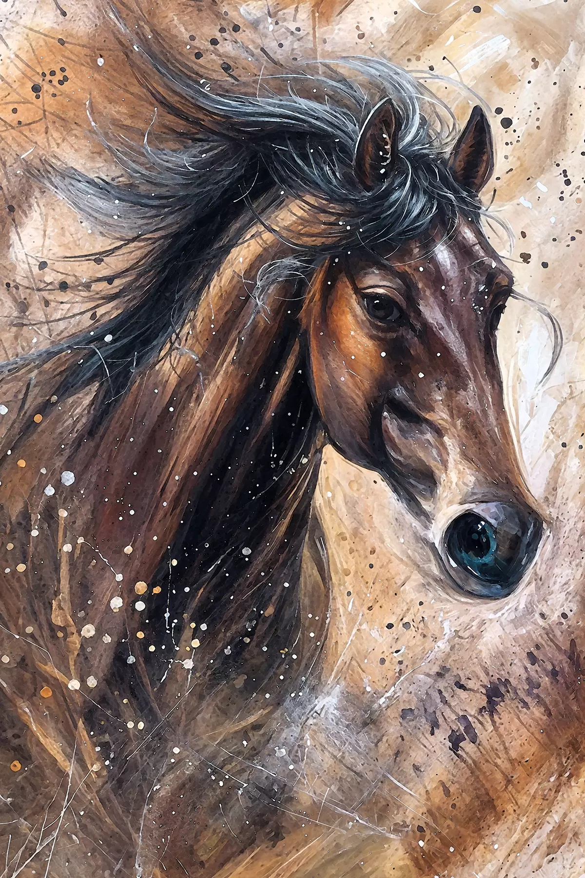 Cuadros Pintura de un caballo marrón con melena suelta, sobre un fondo texturizado con toques de color Nr s38959