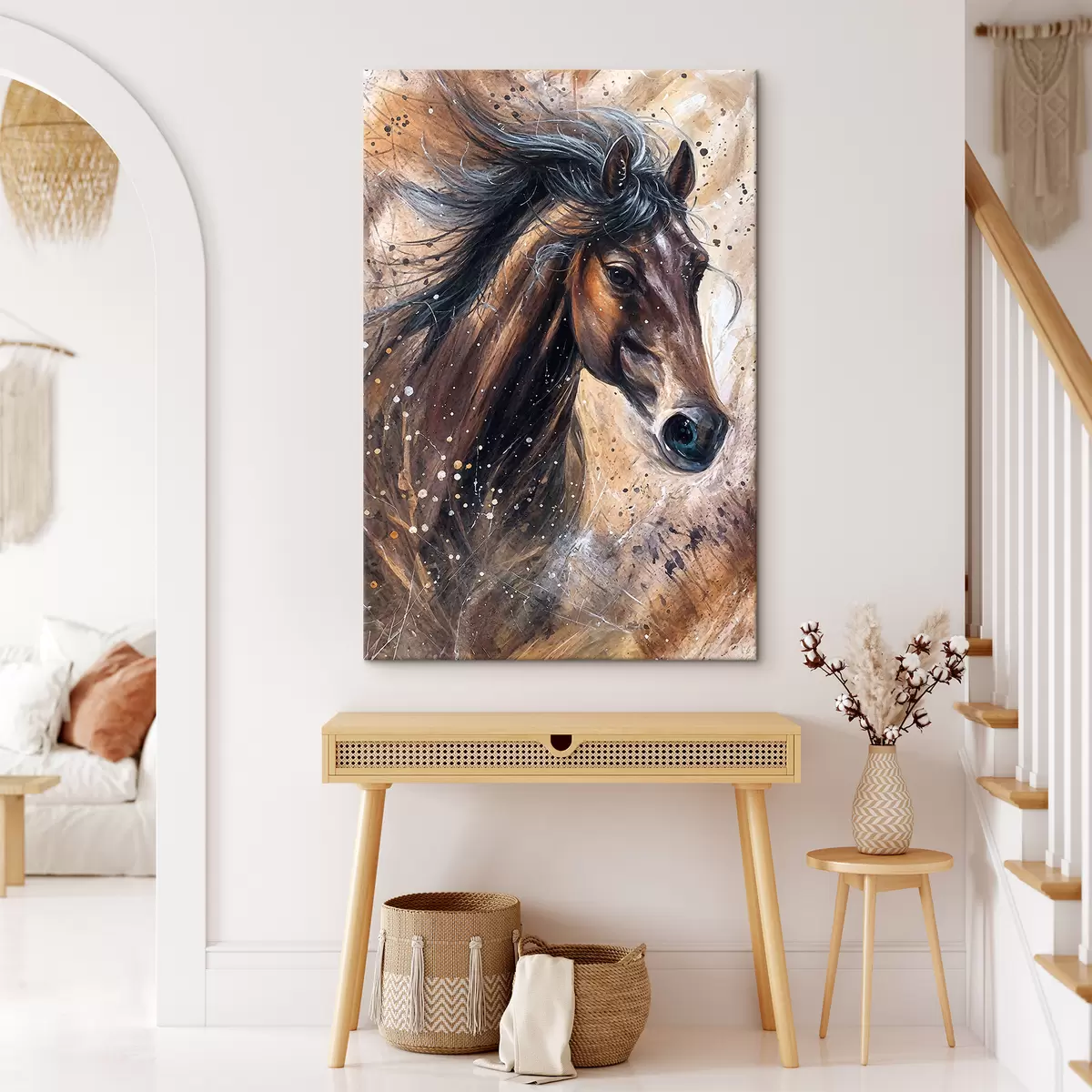Cuadros Pintura de un caballo marrón con melena suelta, sobre un fondo texturizado con toques de color Nr s38959