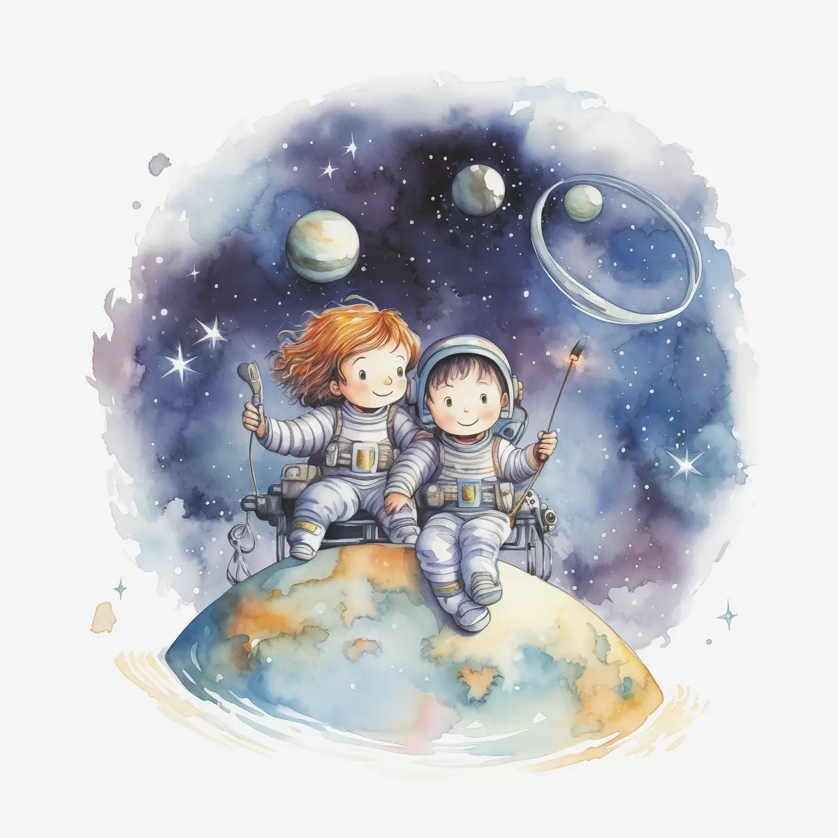 murales de pared Niños en trajes espaciales sentados en un planeta en el espacio ilustración de acuarela para niños s39117