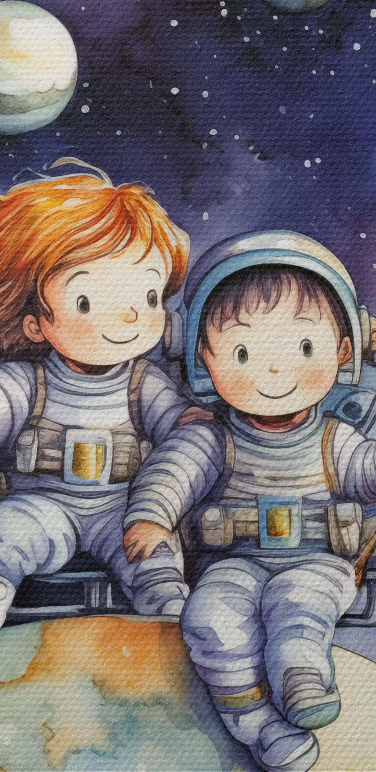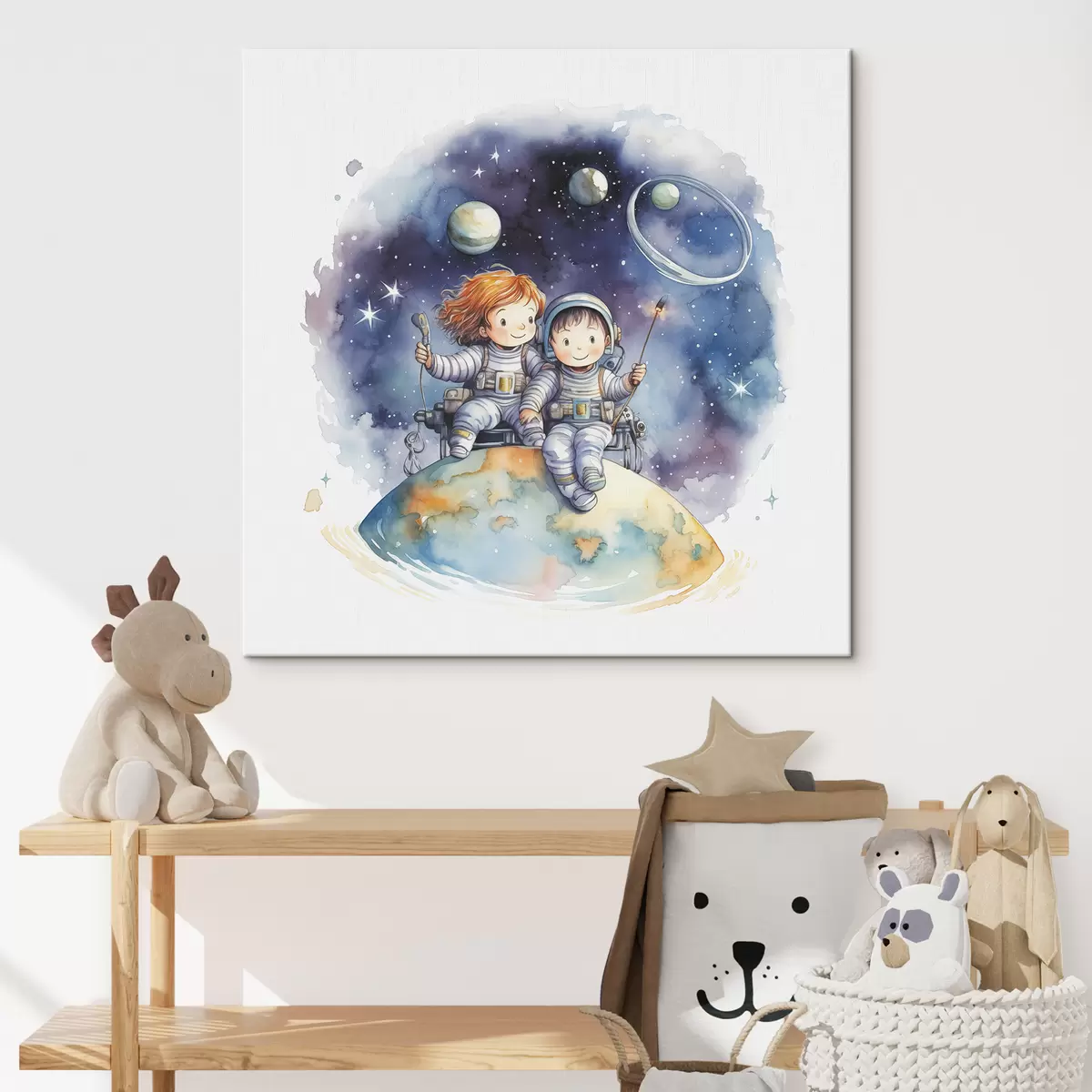 Cuadros Niños en trajes espaciales sentados en un planeta en el espacio ilustración de acuarela para niños Nr s39117