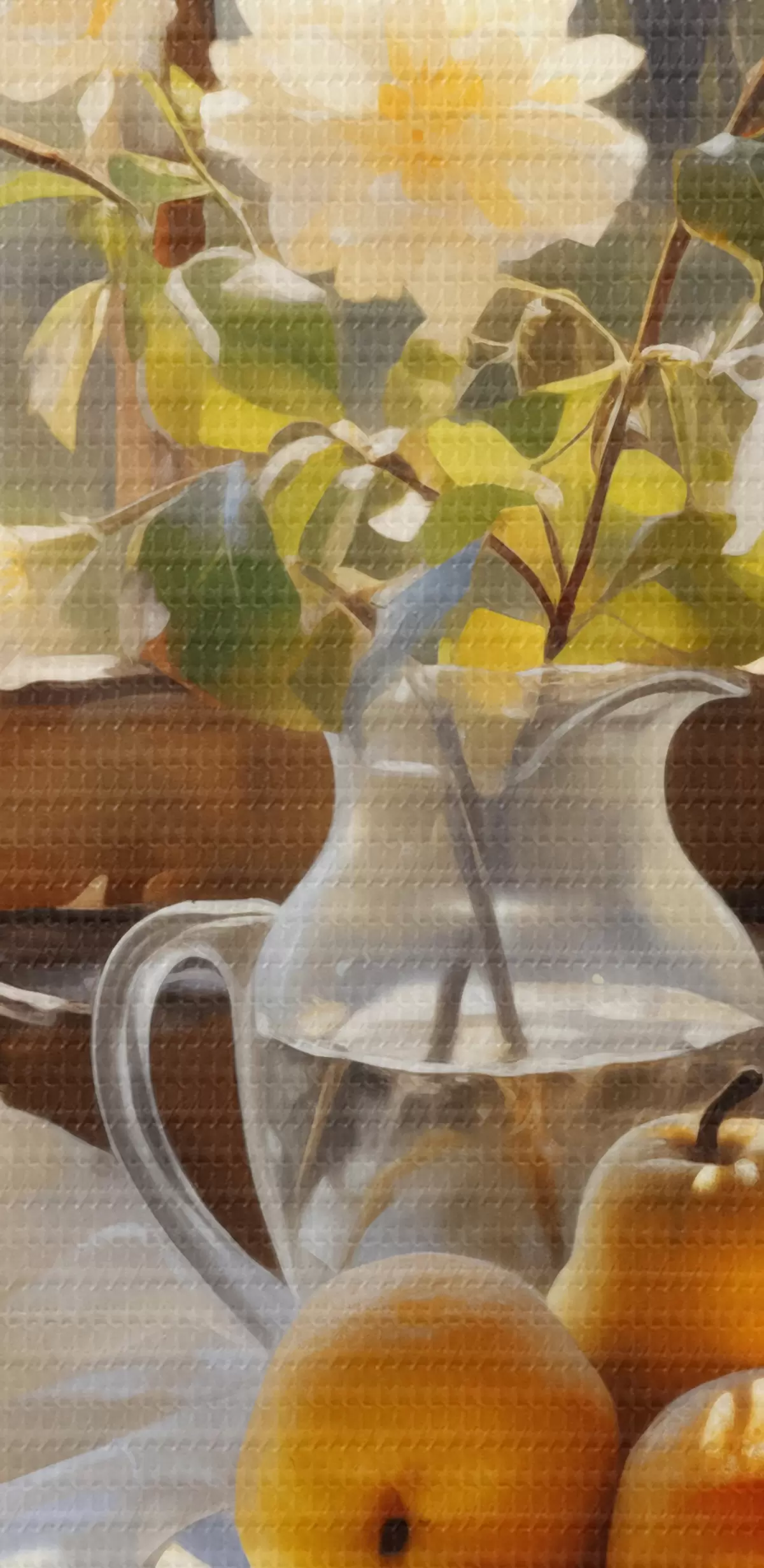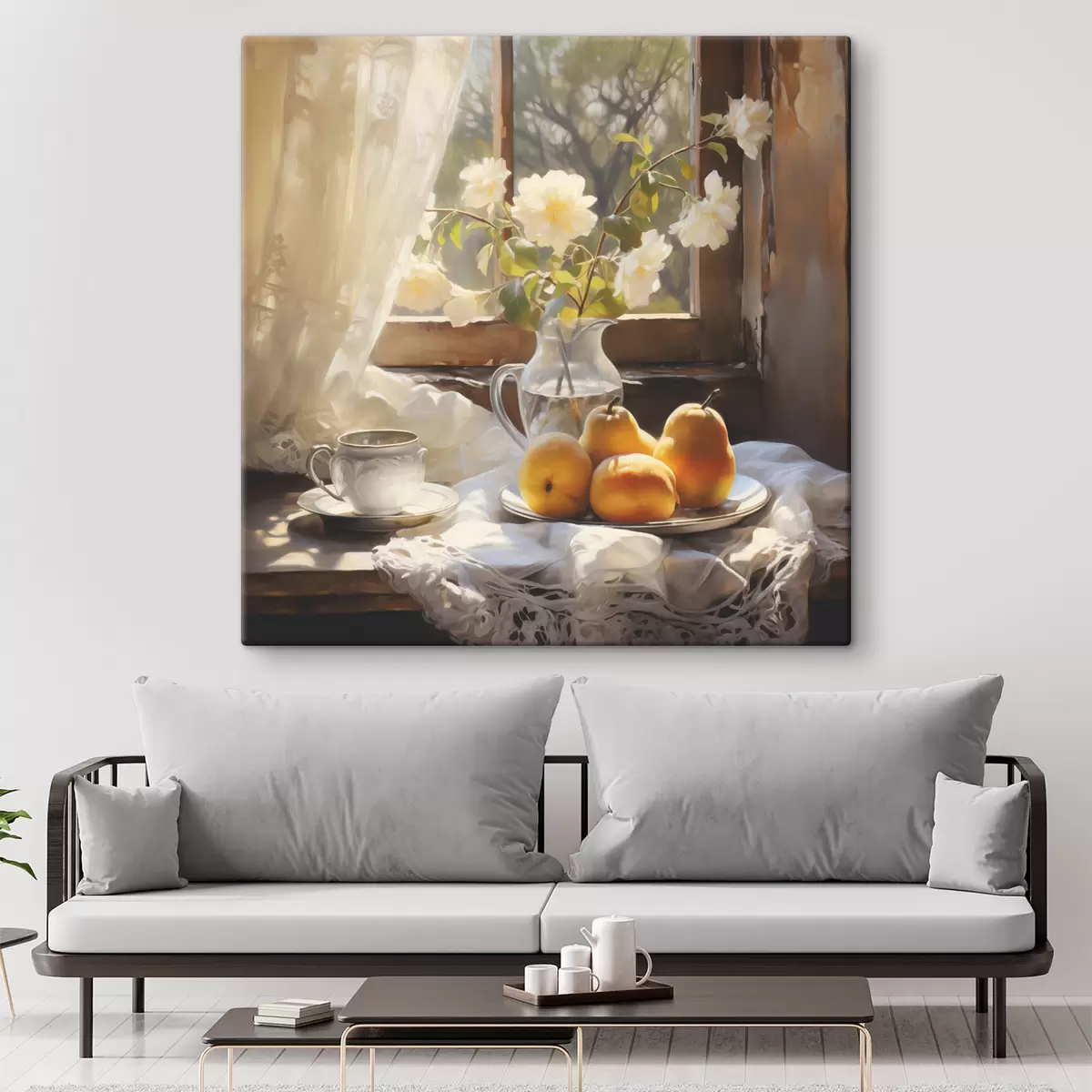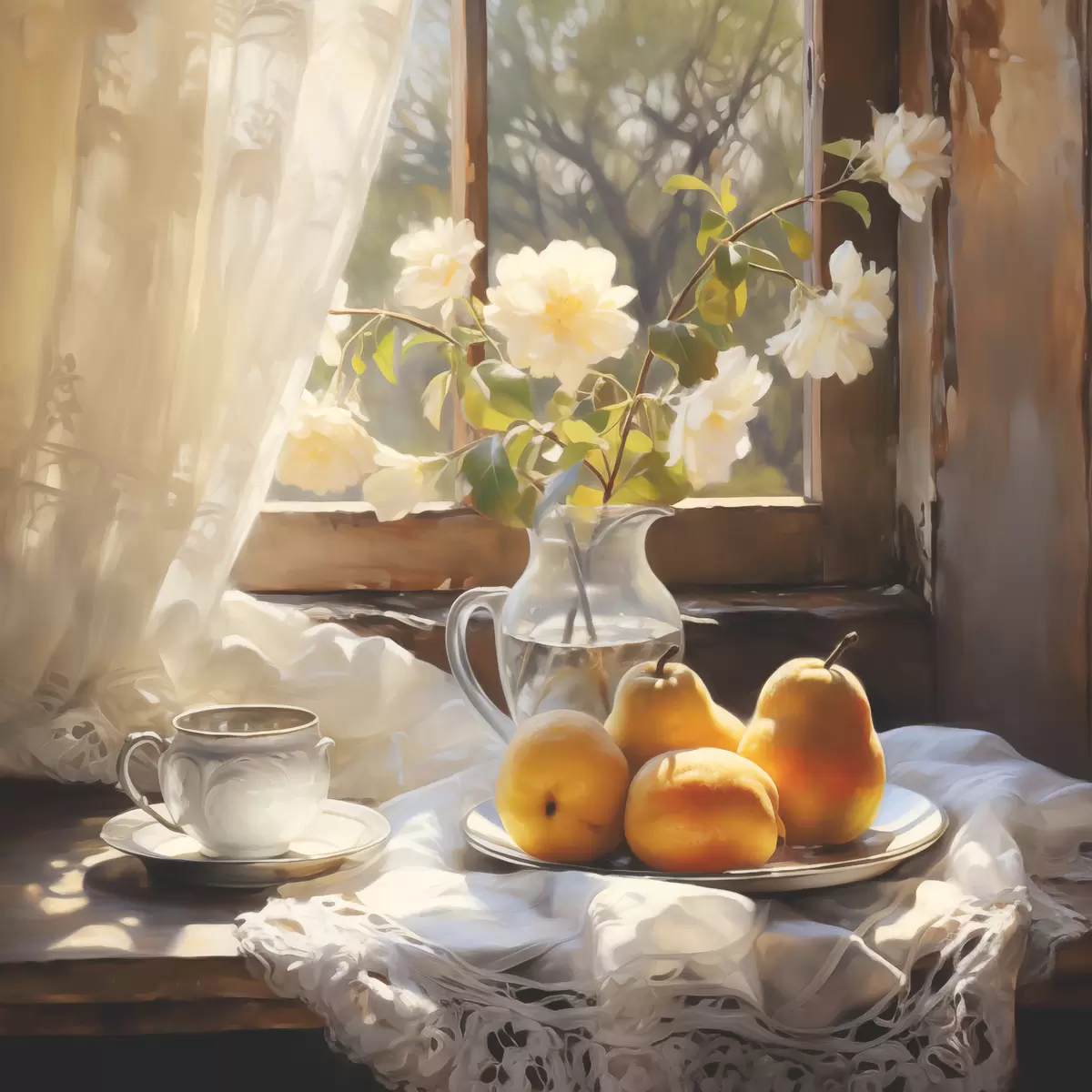 Cuadros Bodegón rústico de peras maduras amarillas en un plato sobre una mesa junto a la ventana, rosas blancas en una jarra de vidrio, cortinas de encaje blanco Nr s39129