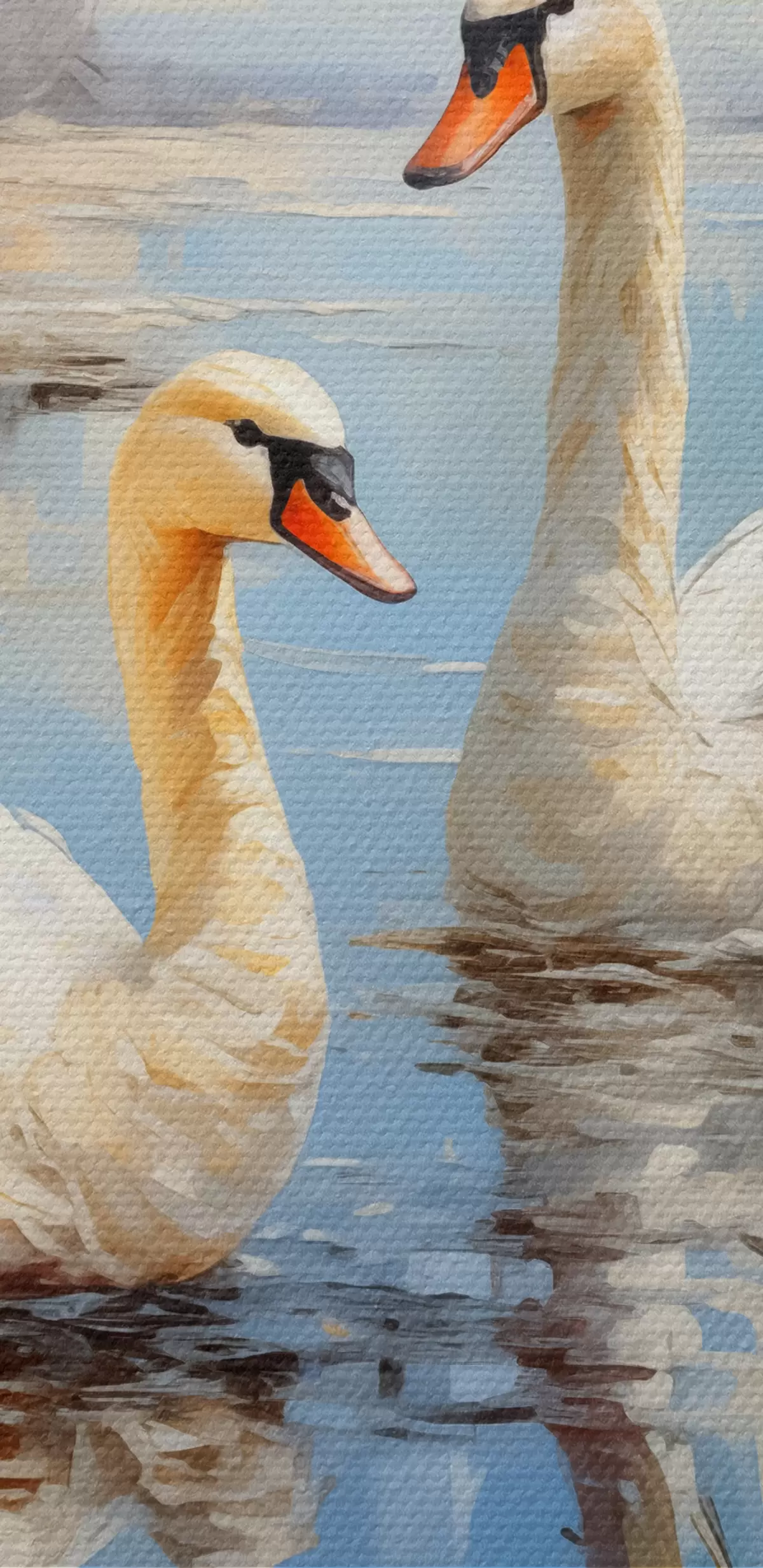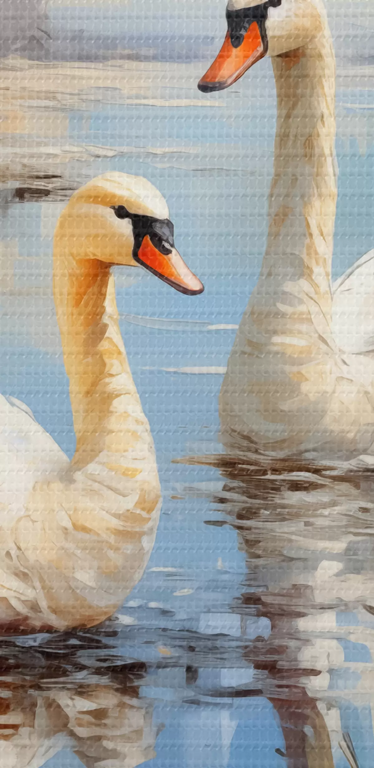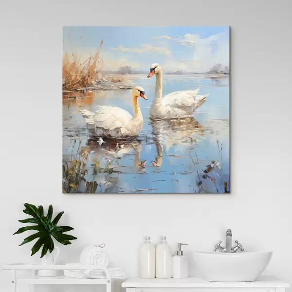Cuadros Los gansos blancos nadan a lo largo del río entre los juncos, de color azul, blanco y beige. Nr s39130