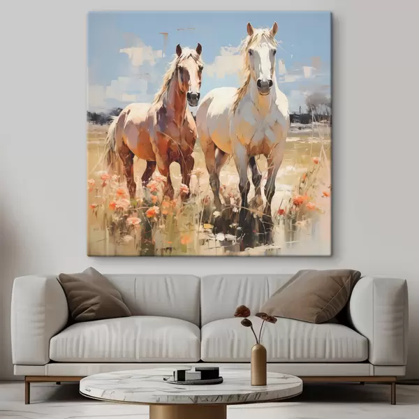 Cuadros Caballos blancos y marrones pastan en un prado entre flores silvestres pintura al óleo arte abstracto Nr s39187