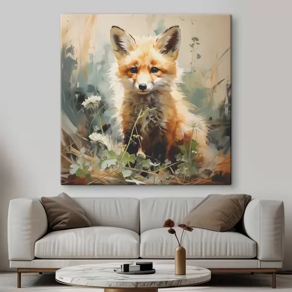 Cuadros Zorro rojo sentado en la hierba seca sobre una pintura al óleo de fondo verde Nr s39191