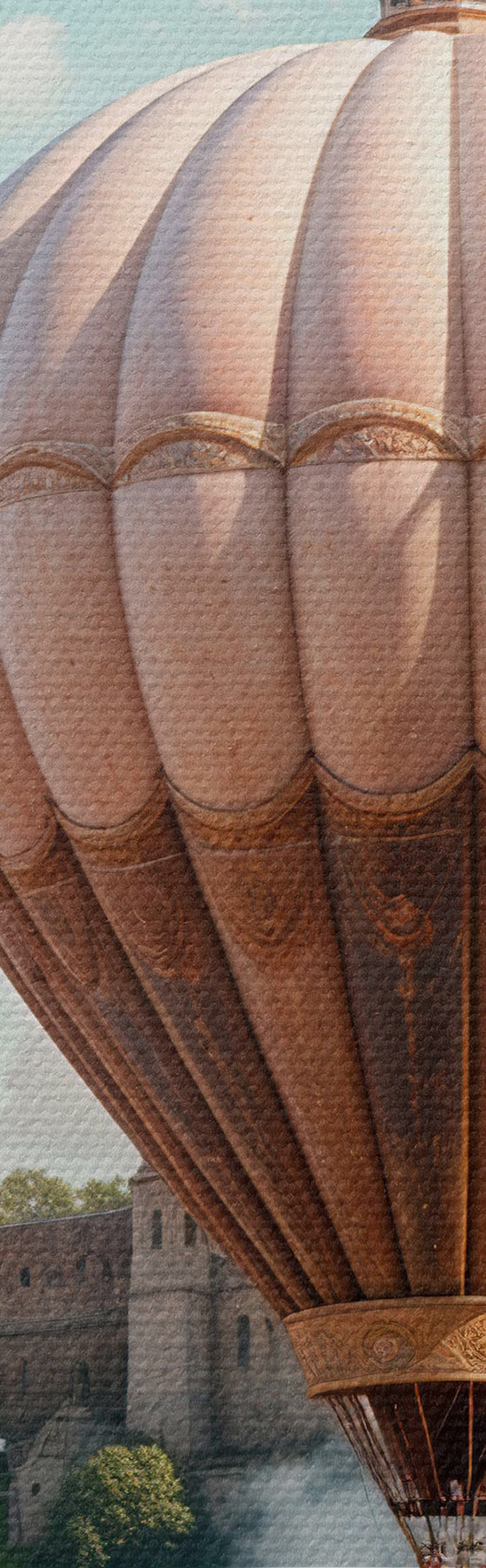 Cuadros Un castillo de fantasía rodeado de globos aerostáticos rosas flotando en un cielo nublado sobre un paisaje verde y exuberante Nr s39387