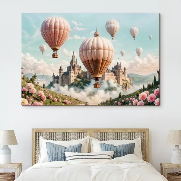 Cuadros Un castillo de fantasía rodeado de globos aerostáticos rosas flotando en un cielo nublado sobre un paisaje verde y exuberante Nr s39387