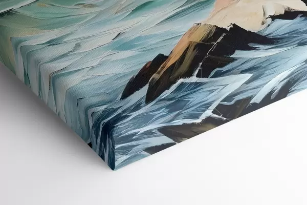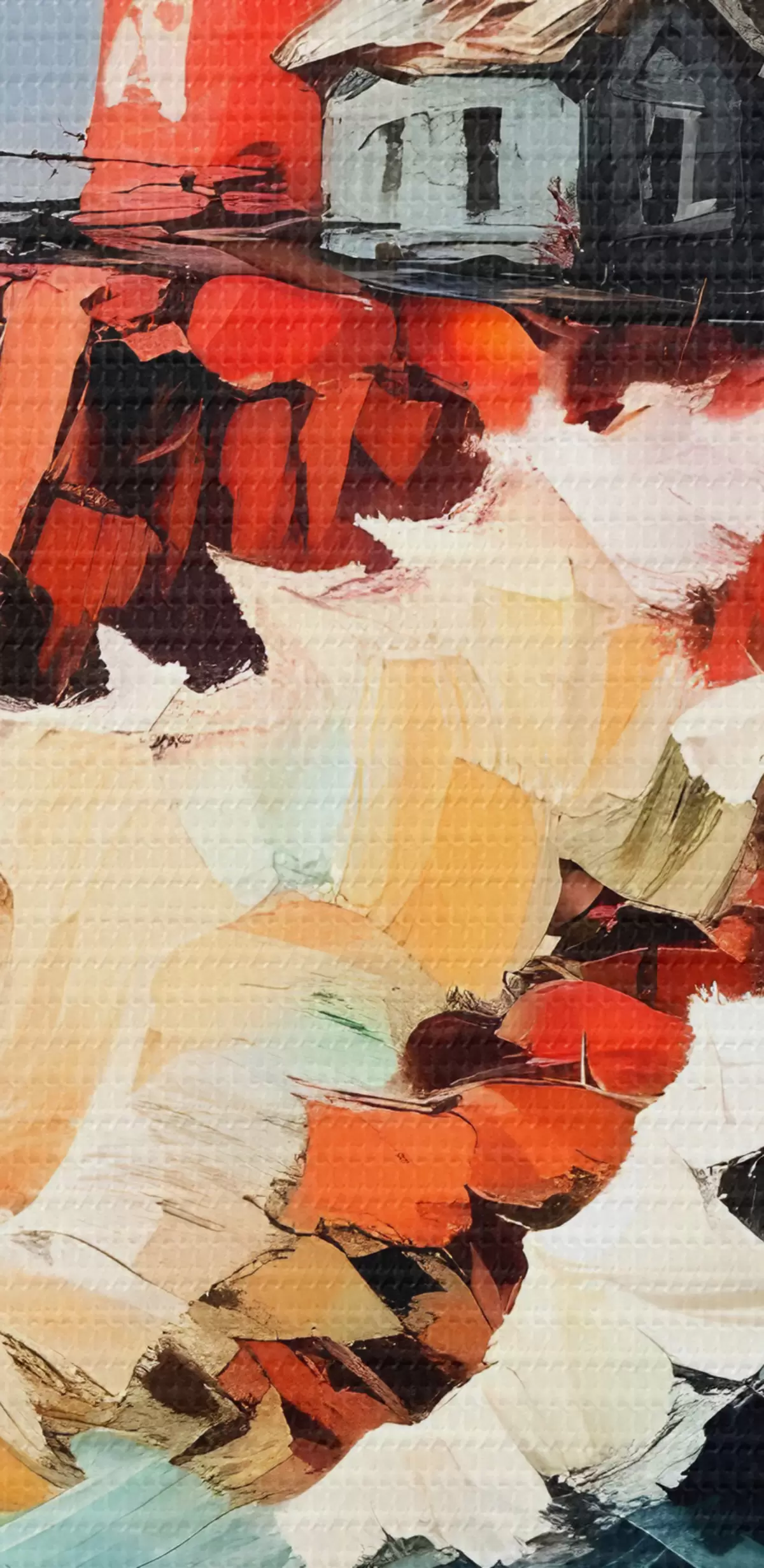 Cuadros Pintura de un faro rojo erguido sobre un acantilado rocoso, rodeado de olas y un cielo tormentoso. Nr s39392
