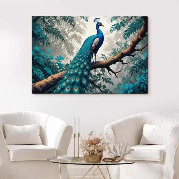 Cuadros Un pavo real azul vibrante posado en la rama de un árbol en un exuberante bosque tropical Nr s39401