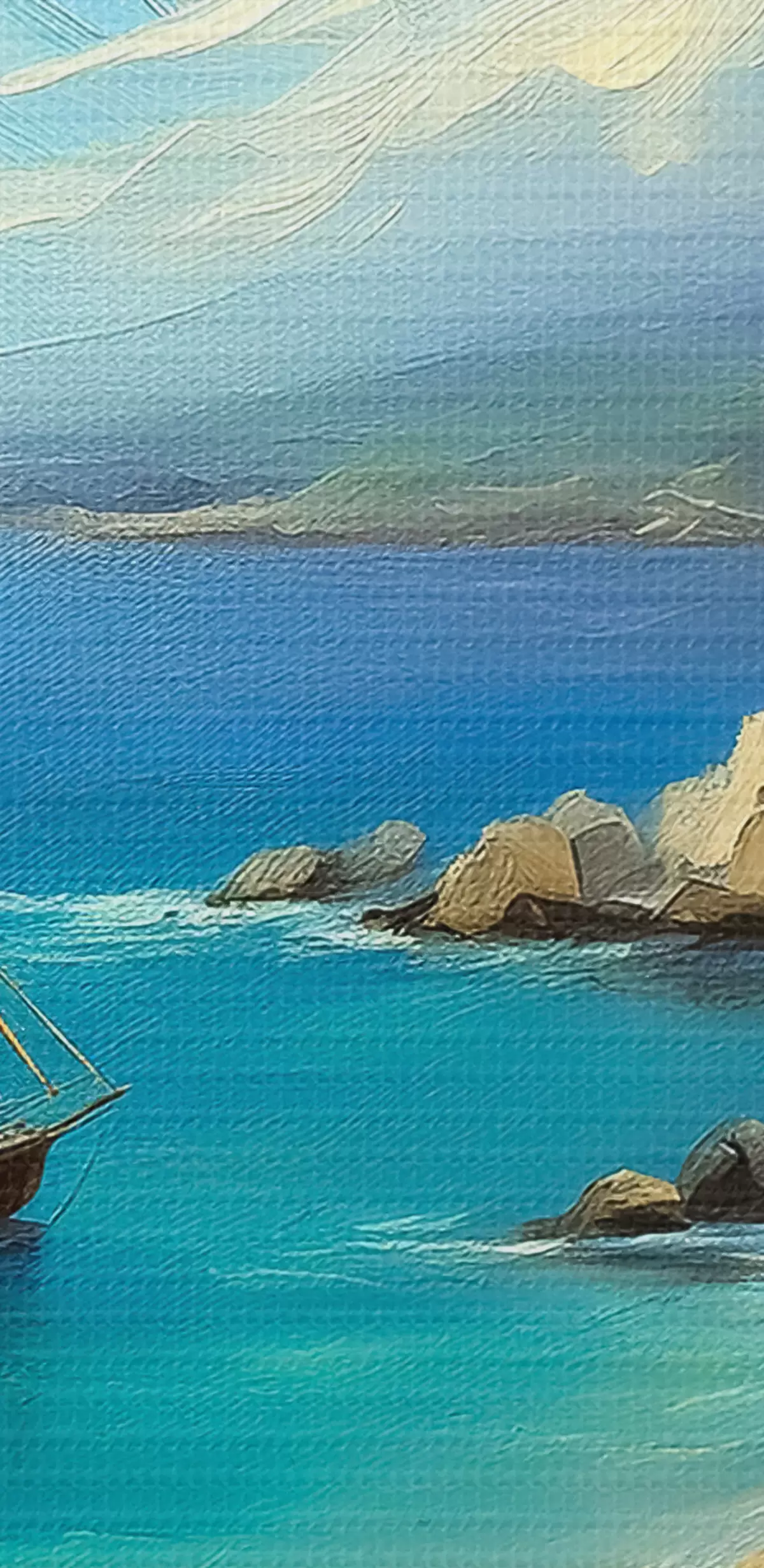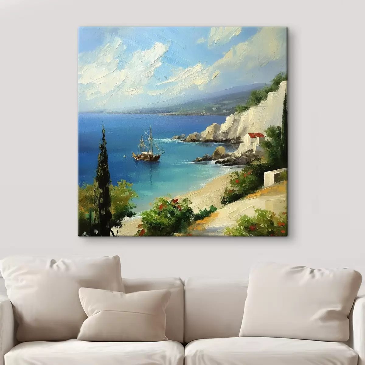murales de pared Costa del mar de Grecia, barco, agua azul, pintura al óleo, naturaleza de verano, rocas, pinceladas vívidas s39425