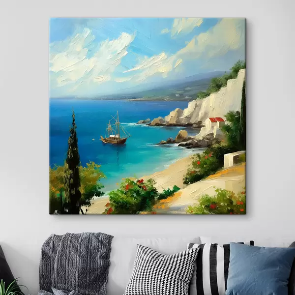 murales de pared Costa del mar de Grecia, barco, agua azul, pintura al óleo, naturaleza de verano, rocas, pinceladas vívidas s39425