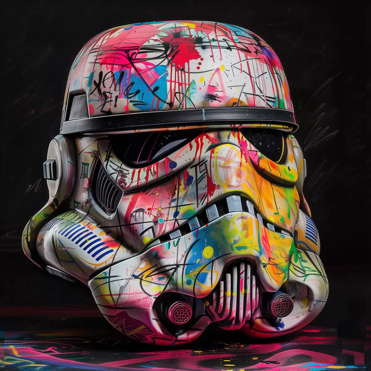 murales de pared Un casco de soldado de asalto de Star Wars cubierto de vibrantes arte callejero y graffiti. s39453