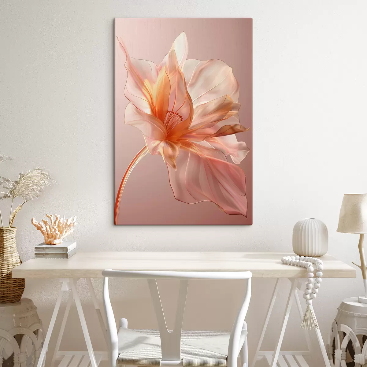 murales de pared Pétalo de flor de melocotón sobre un fondo rosa con líneas fluidas, minimalismo y detalles delicados. s39631