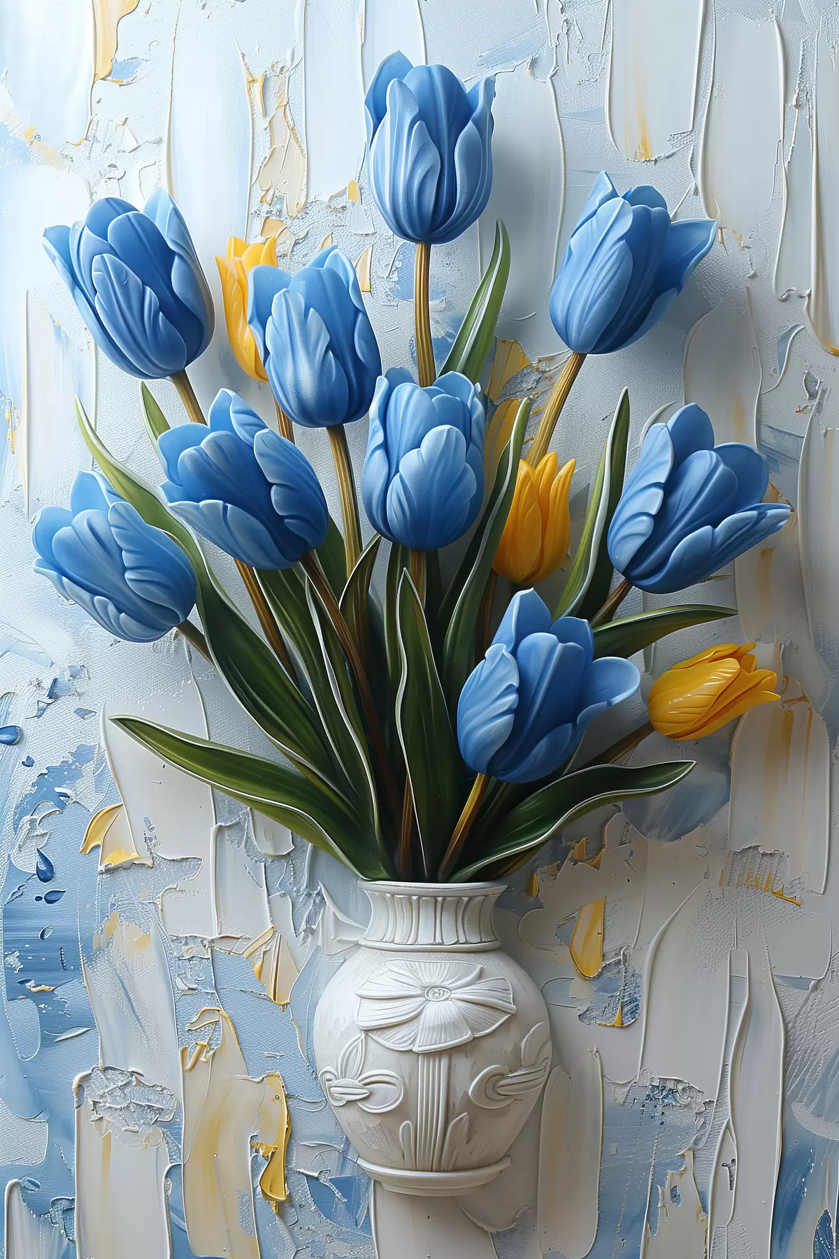 murales de pared Tulipanes azules y amarillos en 3D: elegante cuadro pintado al óleo con fondo blanco y azul claro y jarrón grabado s39637