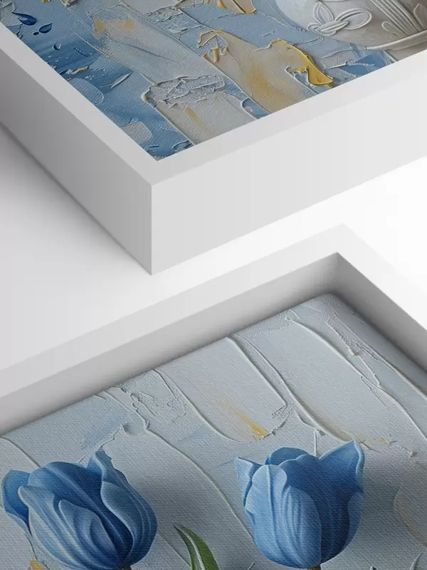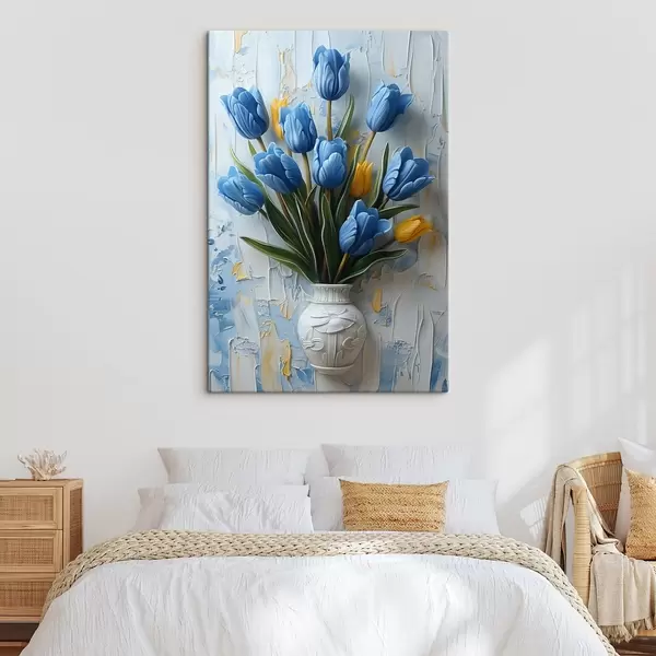 Cuadros Tulipanes azules y amarillos en 3D: elegante cuadro pintado al óleo con fondo blanco y azul claro y jarrón grabado Nr s39637
