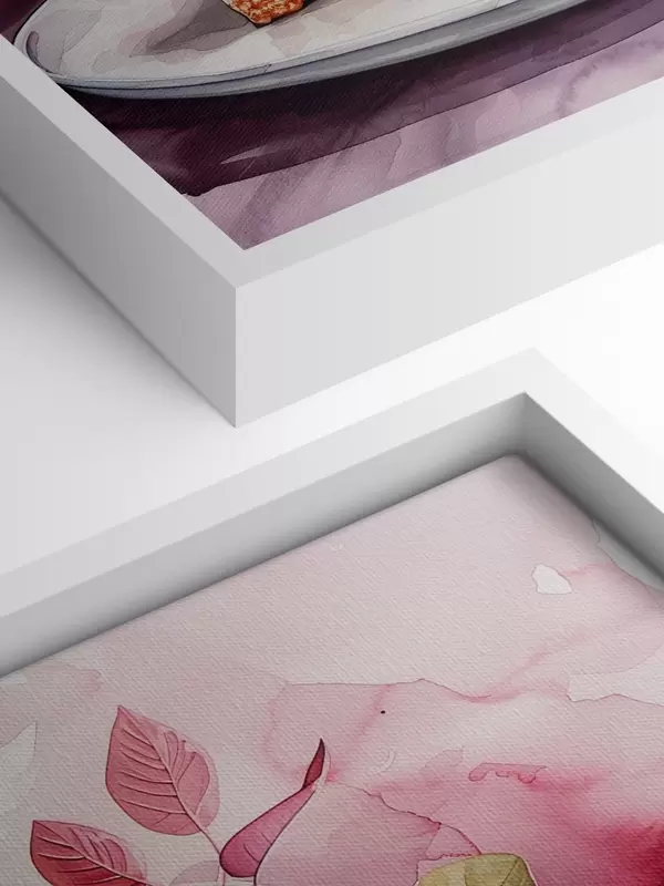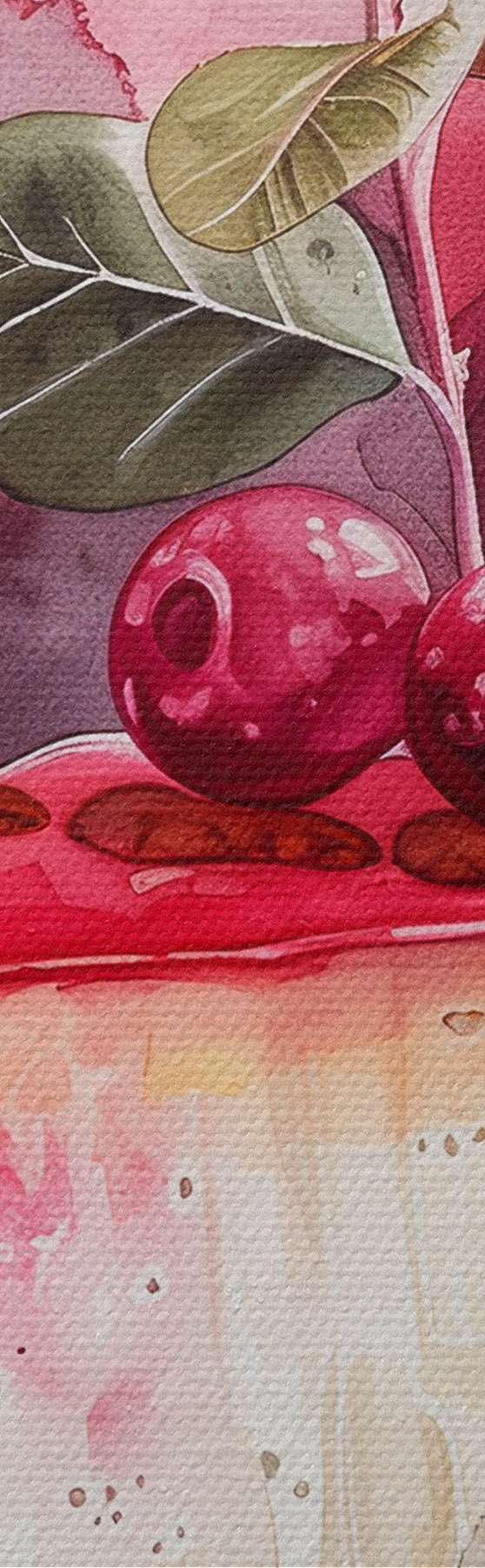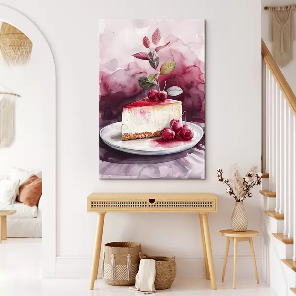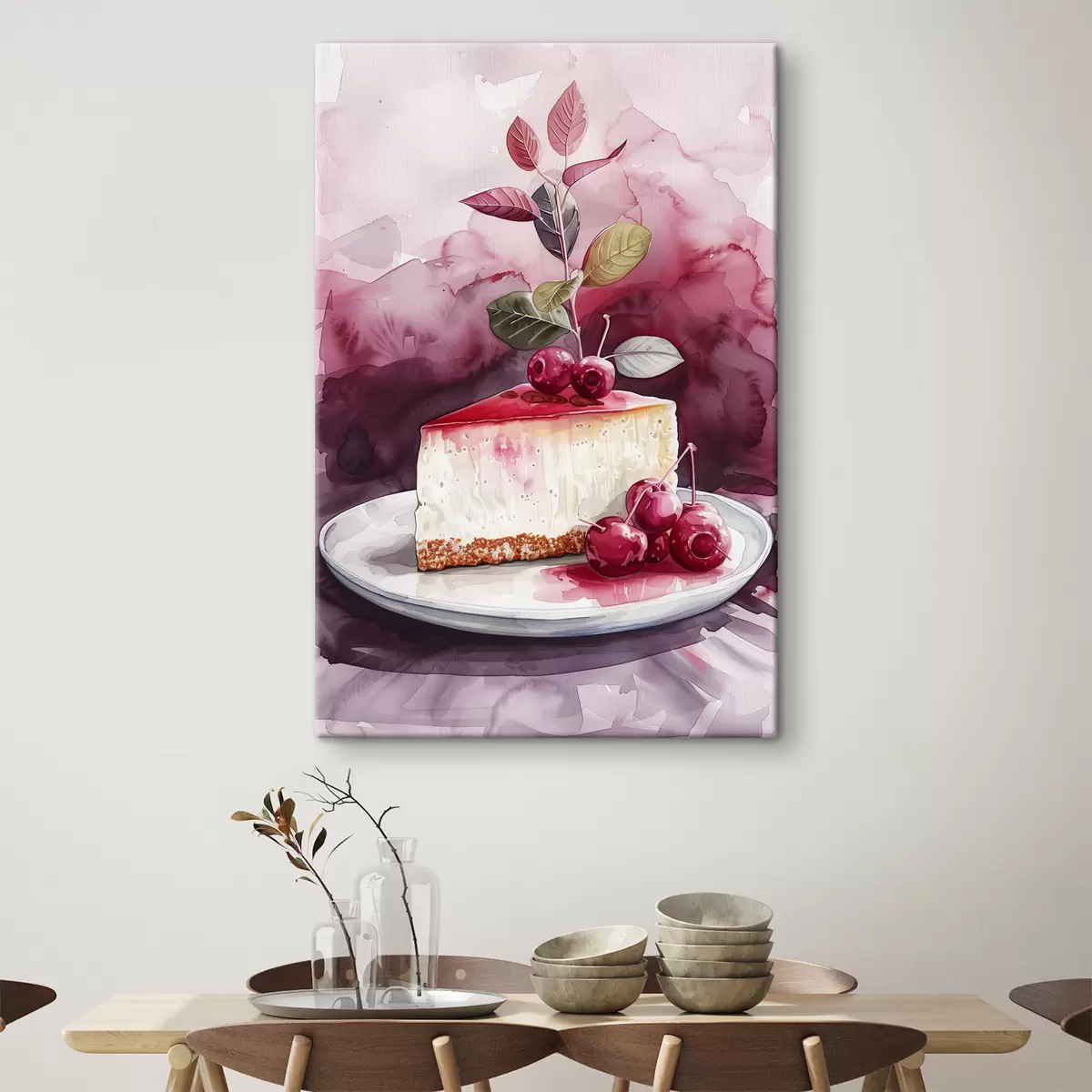 Cuadros Tarta de queso acuarela con cerezas, arte gastronómico elegante, colores rojo y morado Nr s39700