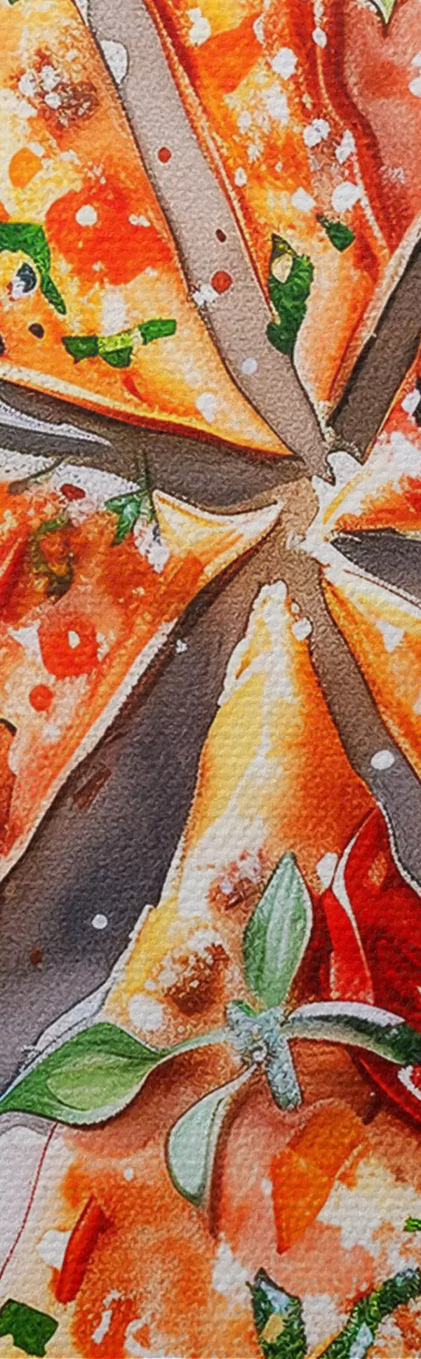 murales de pared Pizza acuarela, deliciosa, tomates y queso, arte alimentario, mesa de madera s39704