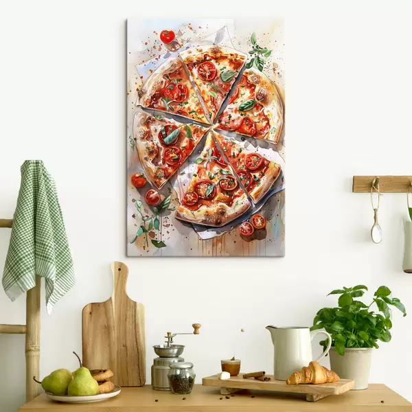 Cuadros Pizza acuarela, deliciosa, tomates y queso, arte alimentario, mesa de madera Nr s39704