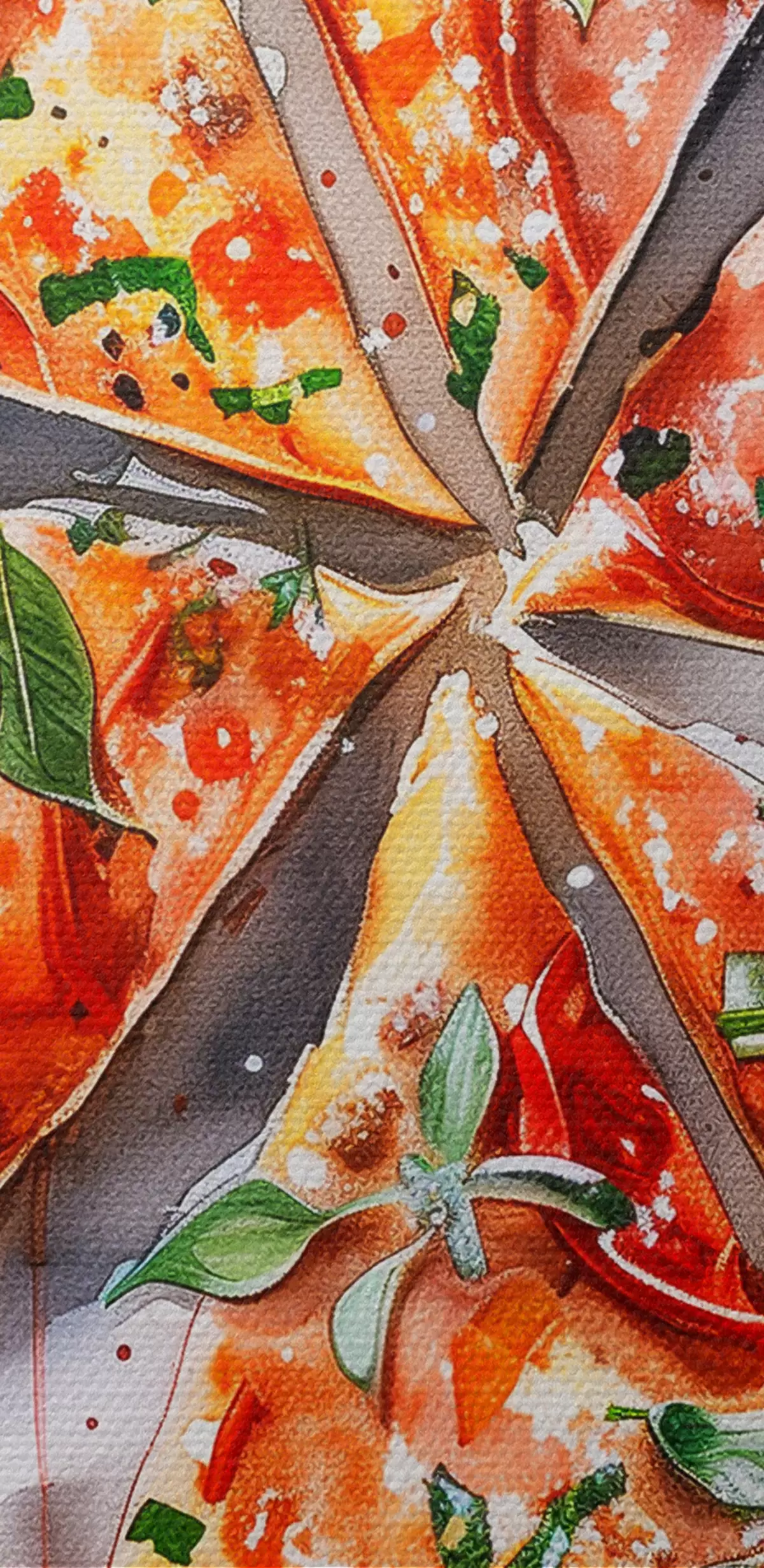 murales de pared Pizza acuarela, deliciosa, tomates y queso, arte alimentario, mesa de madera s39704