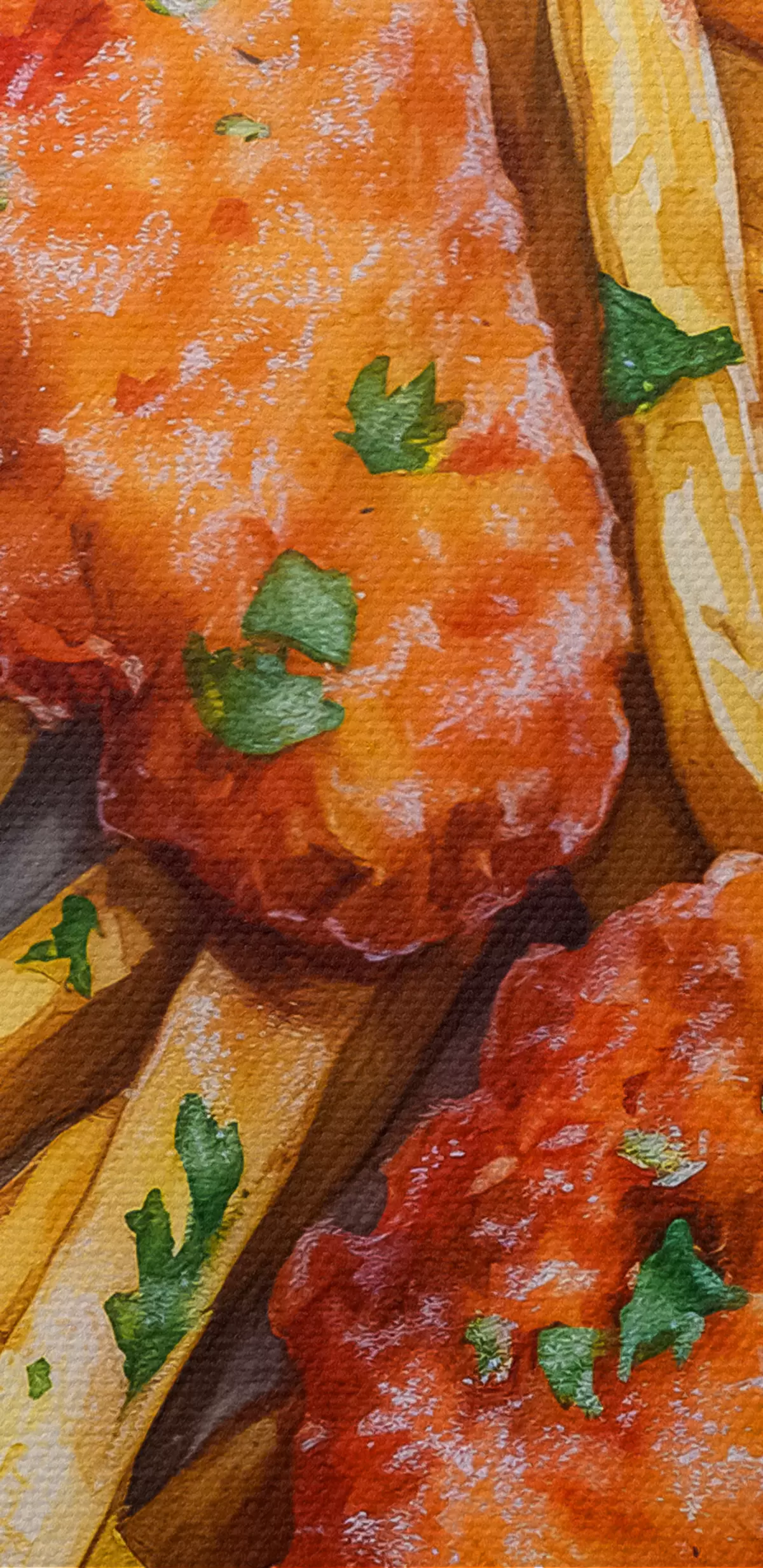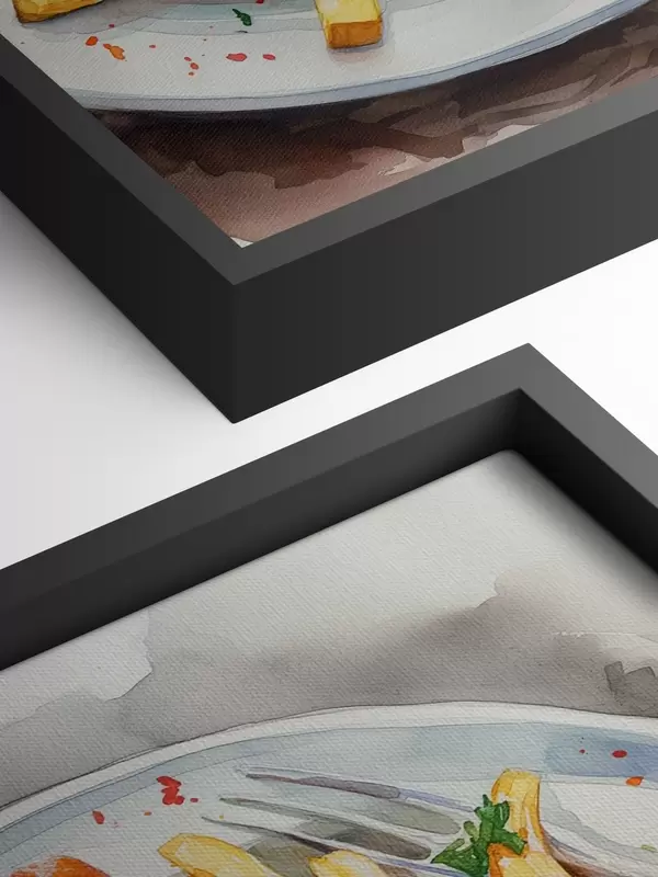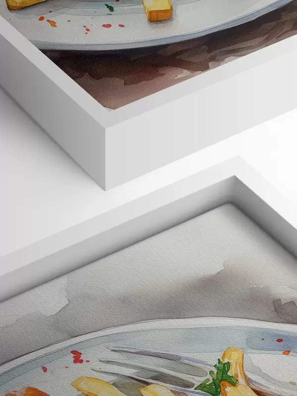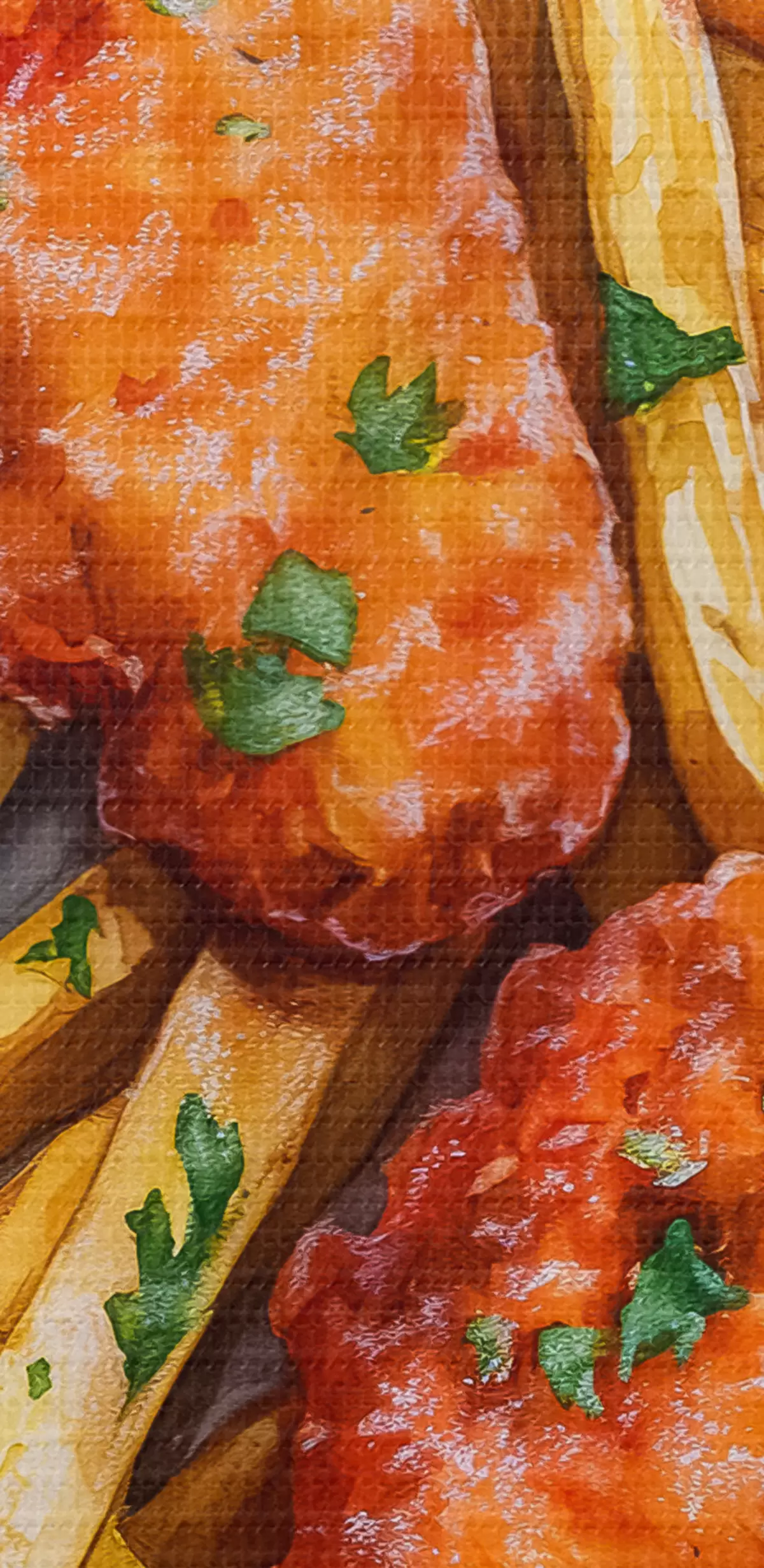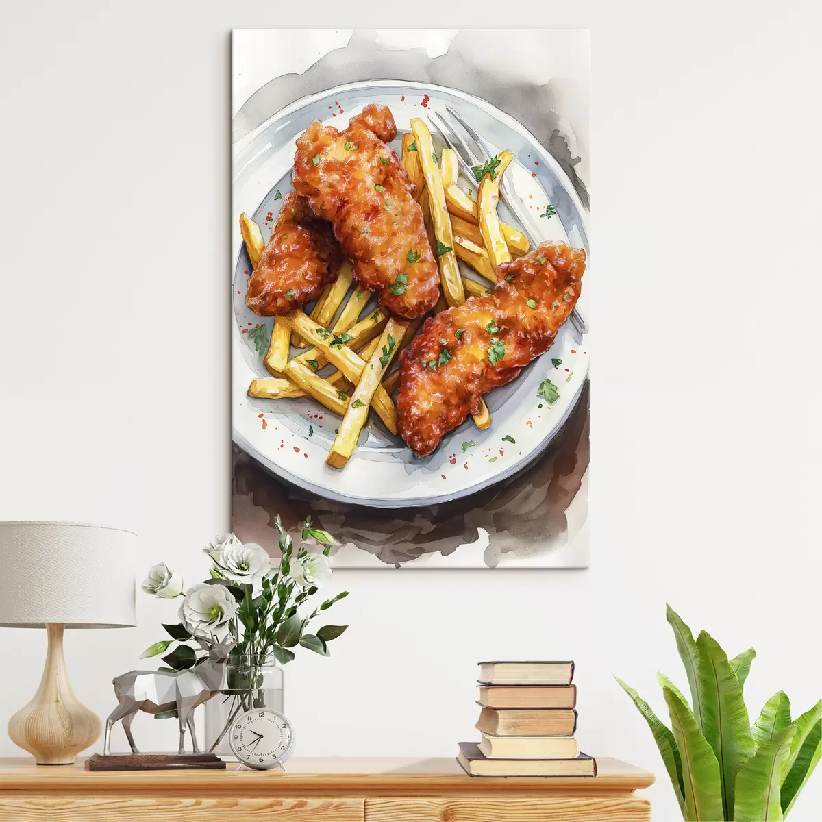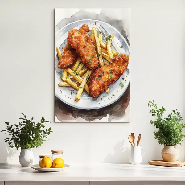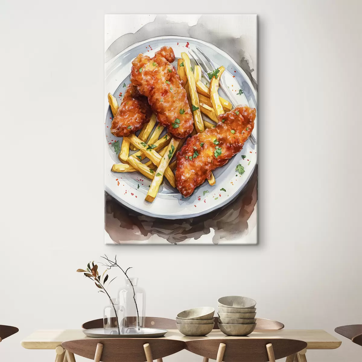 Cuadros Arte gastronómico en acuarela, papas fritas con pollo asado, delicioso Nr s39708