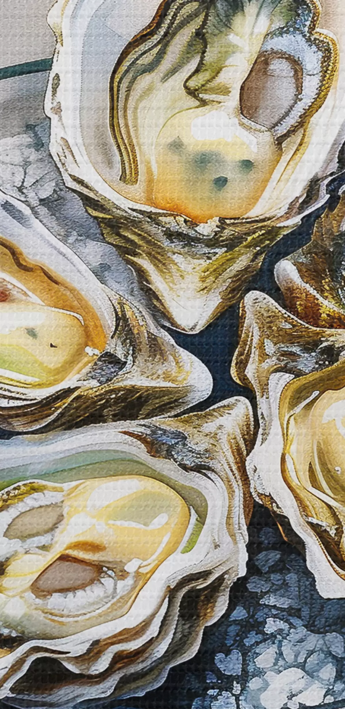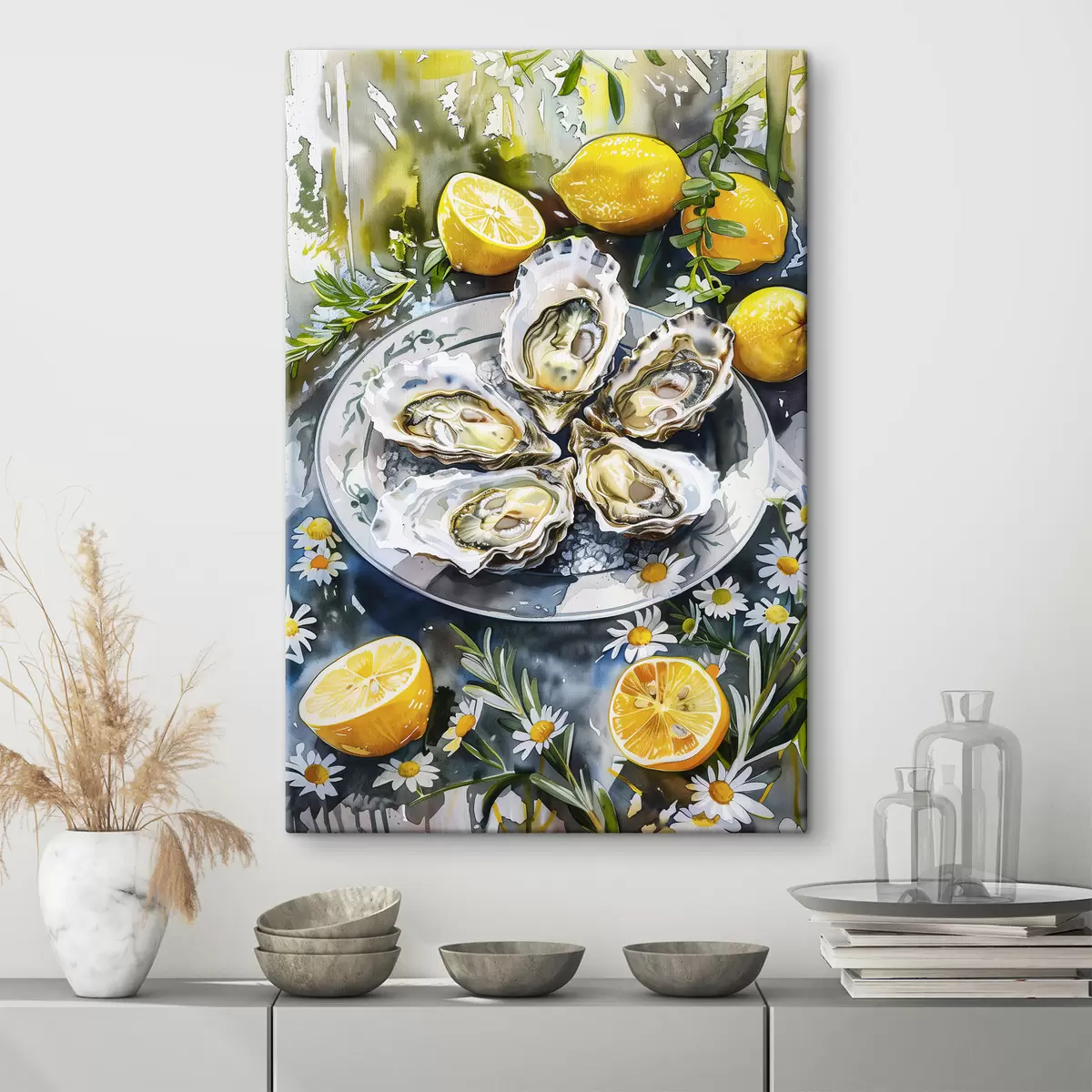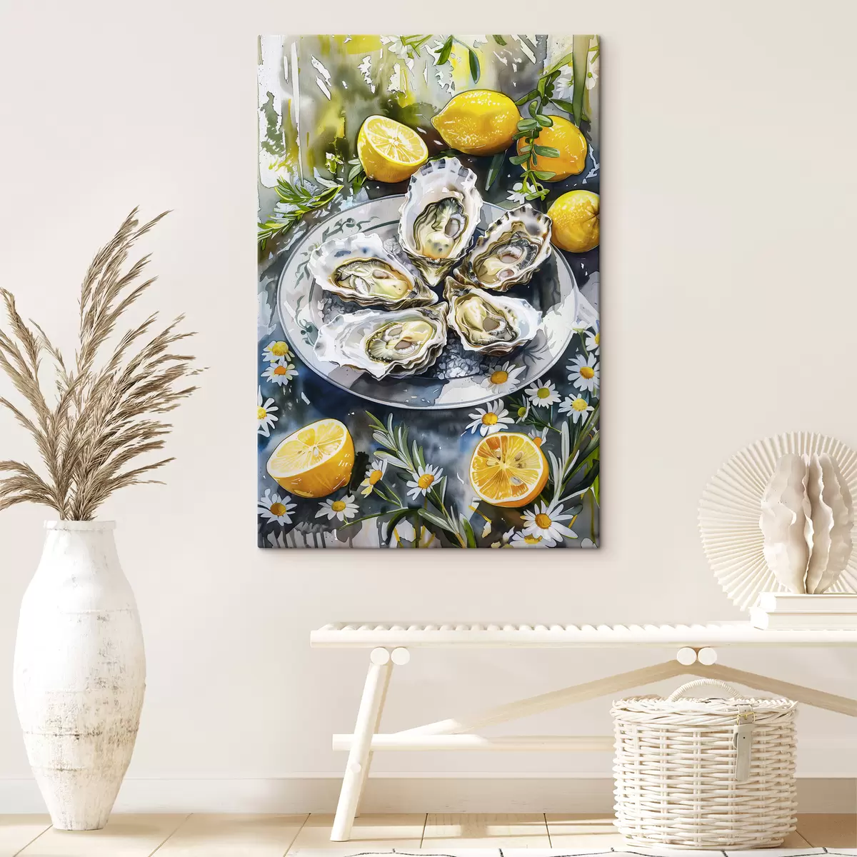 Cuadros Ostras elegantes en el plato, limones y flores, colores de verano, mediterráneo Nr s39710