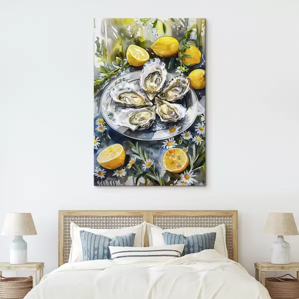 Cuadros Ostras elegantes en el plato, limones y flores, colores de verano, mediterráneo Nr s39710