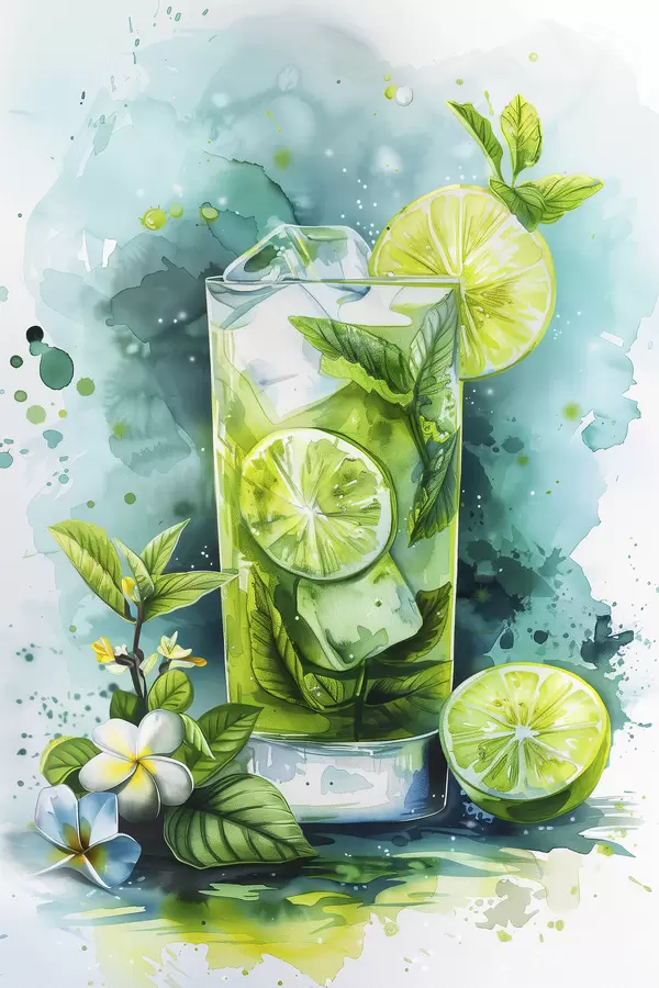 Cuadros Cóctel de verano acuarela, mojito, lima y menta, flores, colores verdes Nr s39712