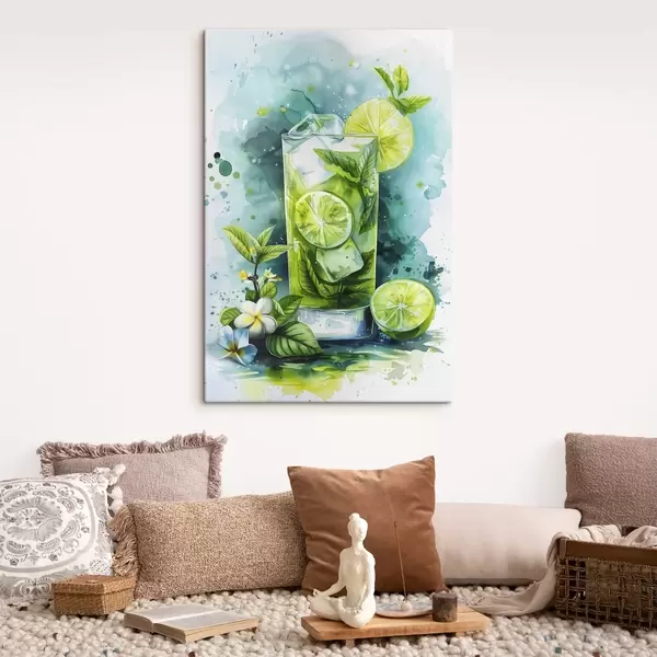 Cuadros Cóctel de verano acuarela, mojito, lima y menta, flores, colores verdes Nr s39712
