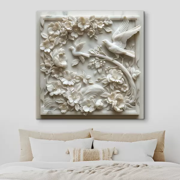 Cuadros Jardín de mármol blanco con bajorrelieve de pájaros y flores. Nr s39728