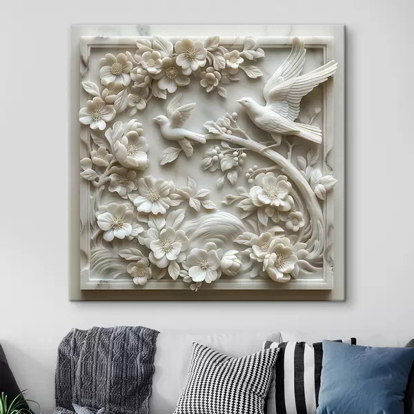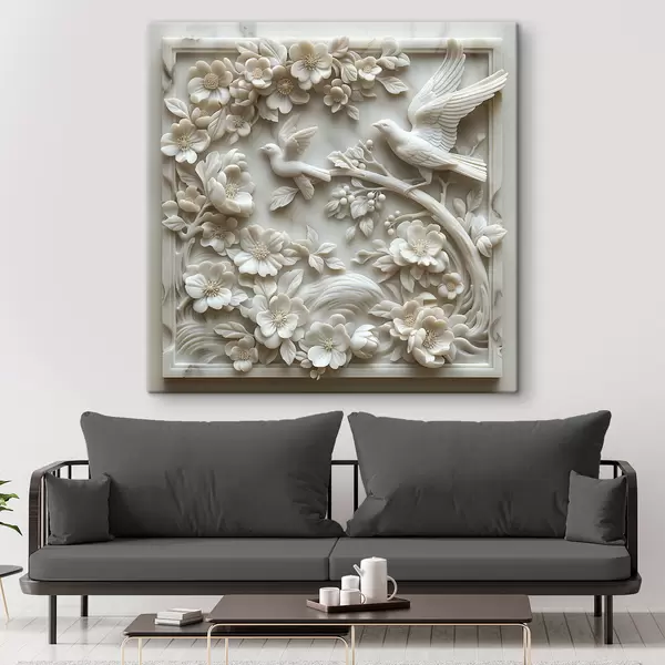 Cuadros Jardín de mármol blanco con bajorrelieve de pájaros y flores. Nr s39728