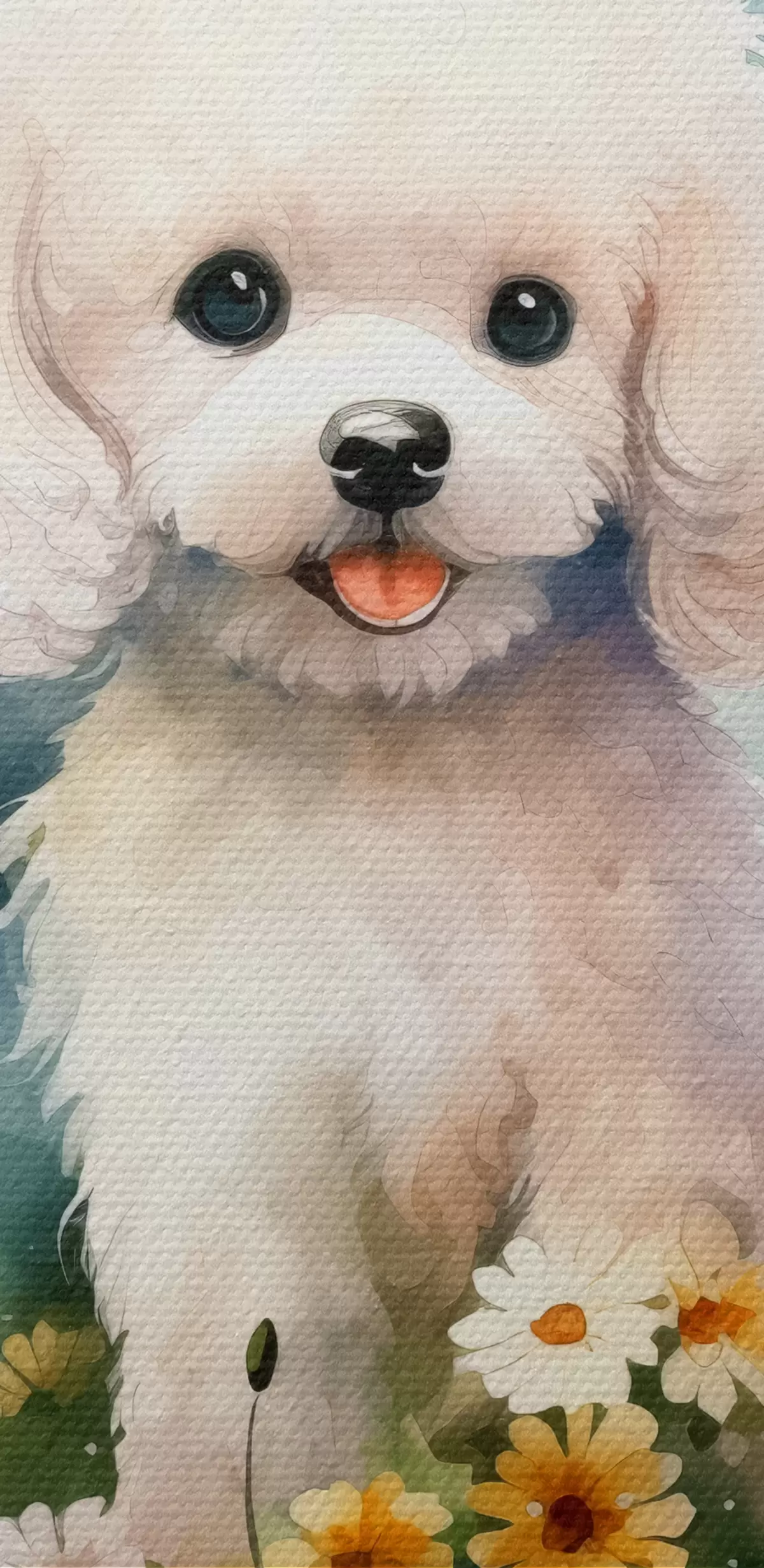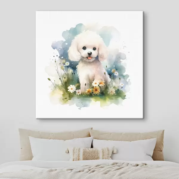 Cuadros Pequeño caniche blanco sentado en flores acuarela Nr s39928