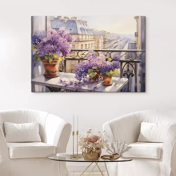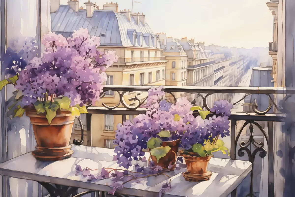 Cuadros Violetas en maceta en un balcón de París acuarela Nr s39931