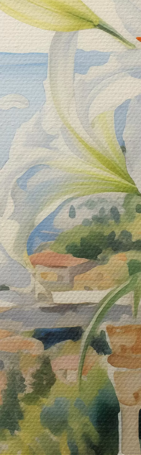 Cuadros Lirios blancos en una maceta en un balcón con el fondo de la bahía acuarela Nr s39932