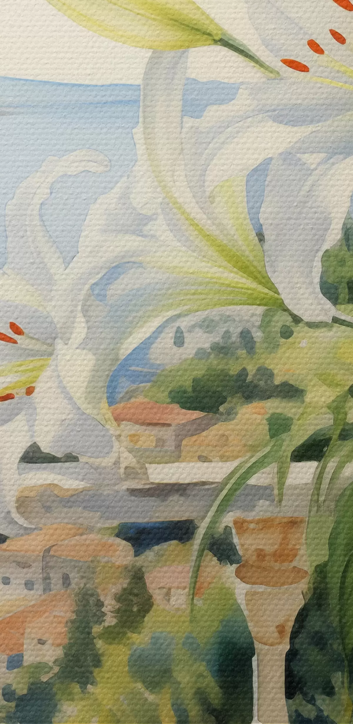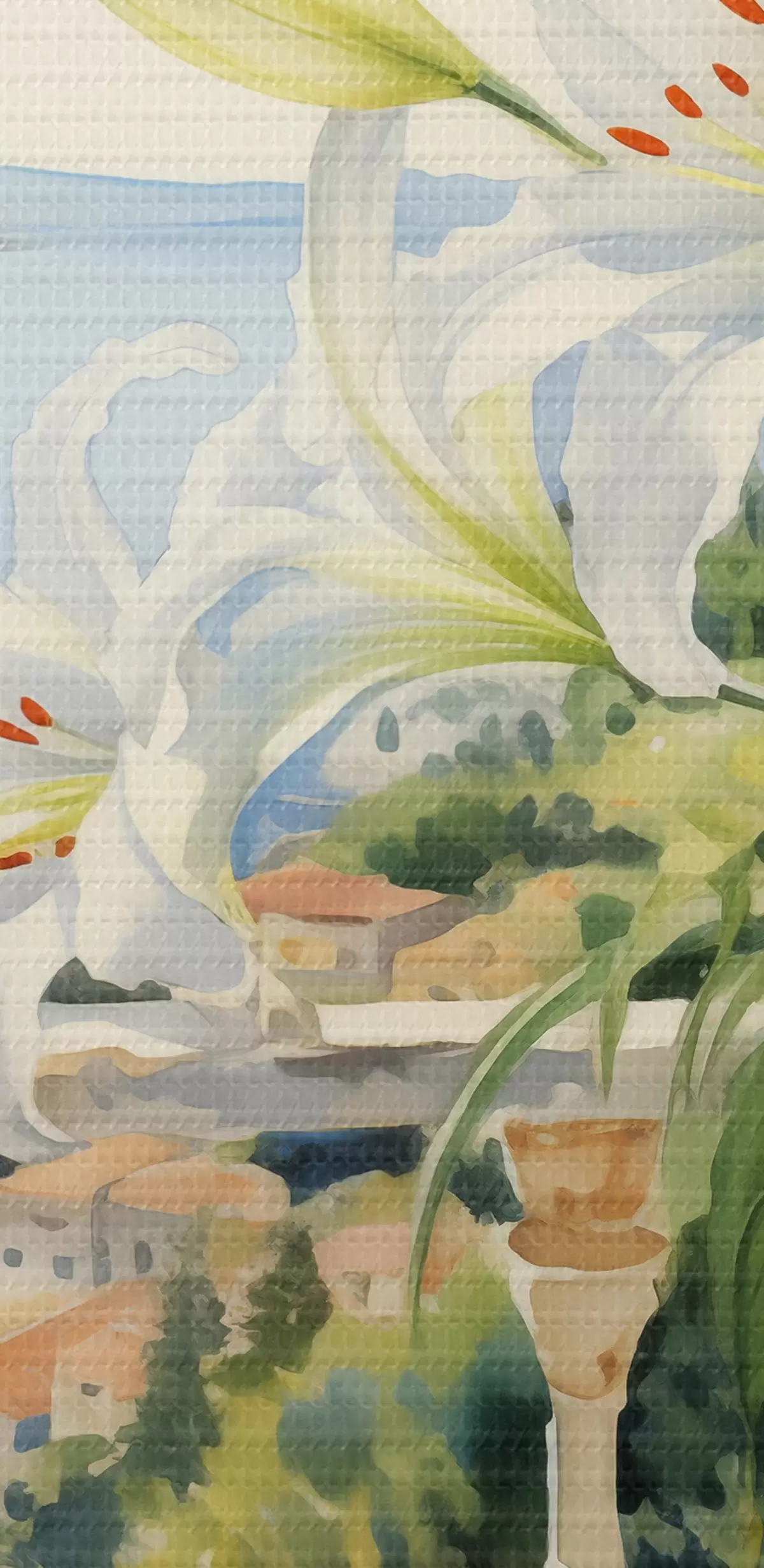 Cuadros Lirios blancos en una maceta en un balcón con el fondo de la bahía acuarela Nr s39932