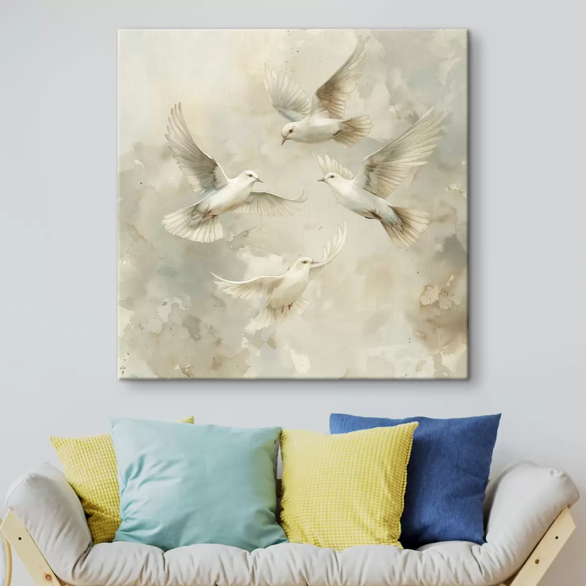 Cuadros Pájaros voladores de acuarela, colores beige y blanco suaves, palomas. Nr s39976