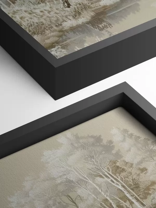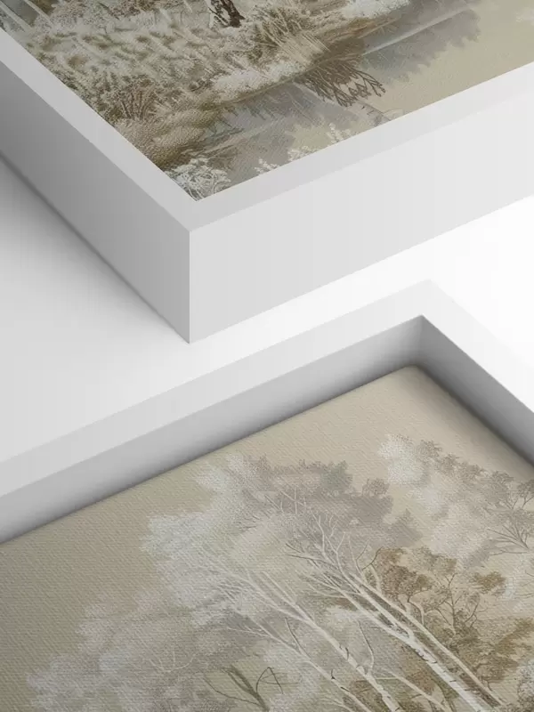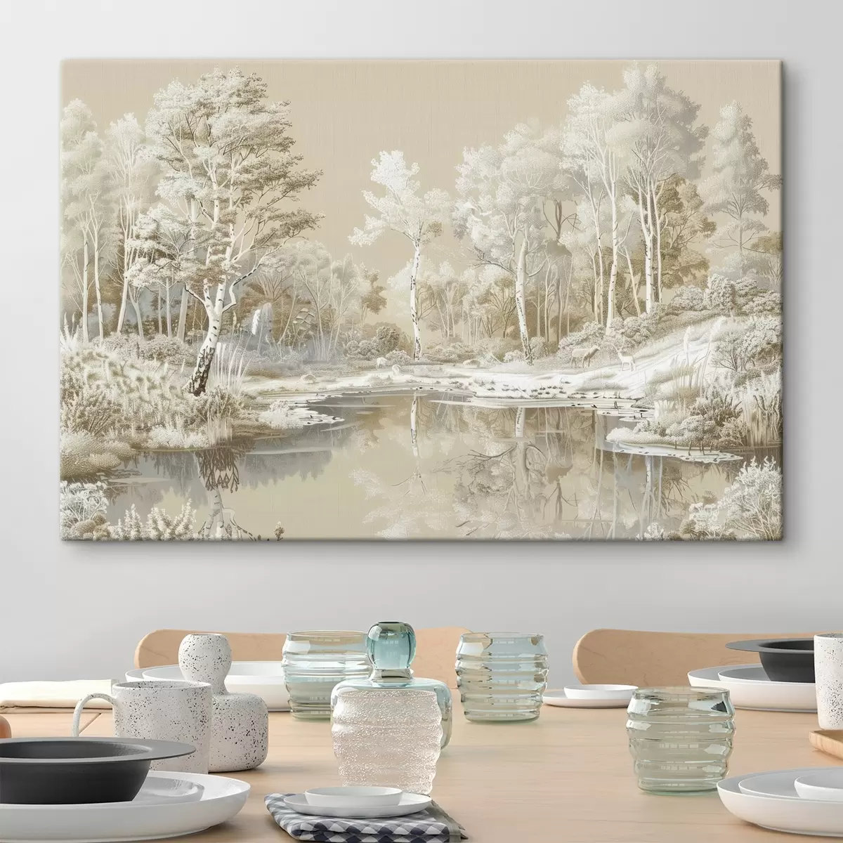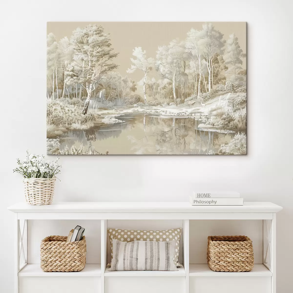 Cuadros Hermoso paisaje forestal, estanque y árboles, colores beige y blanco. Nr s39979