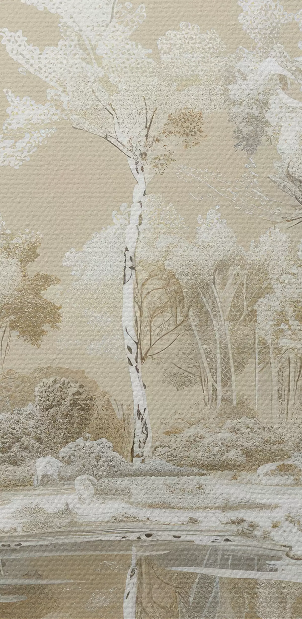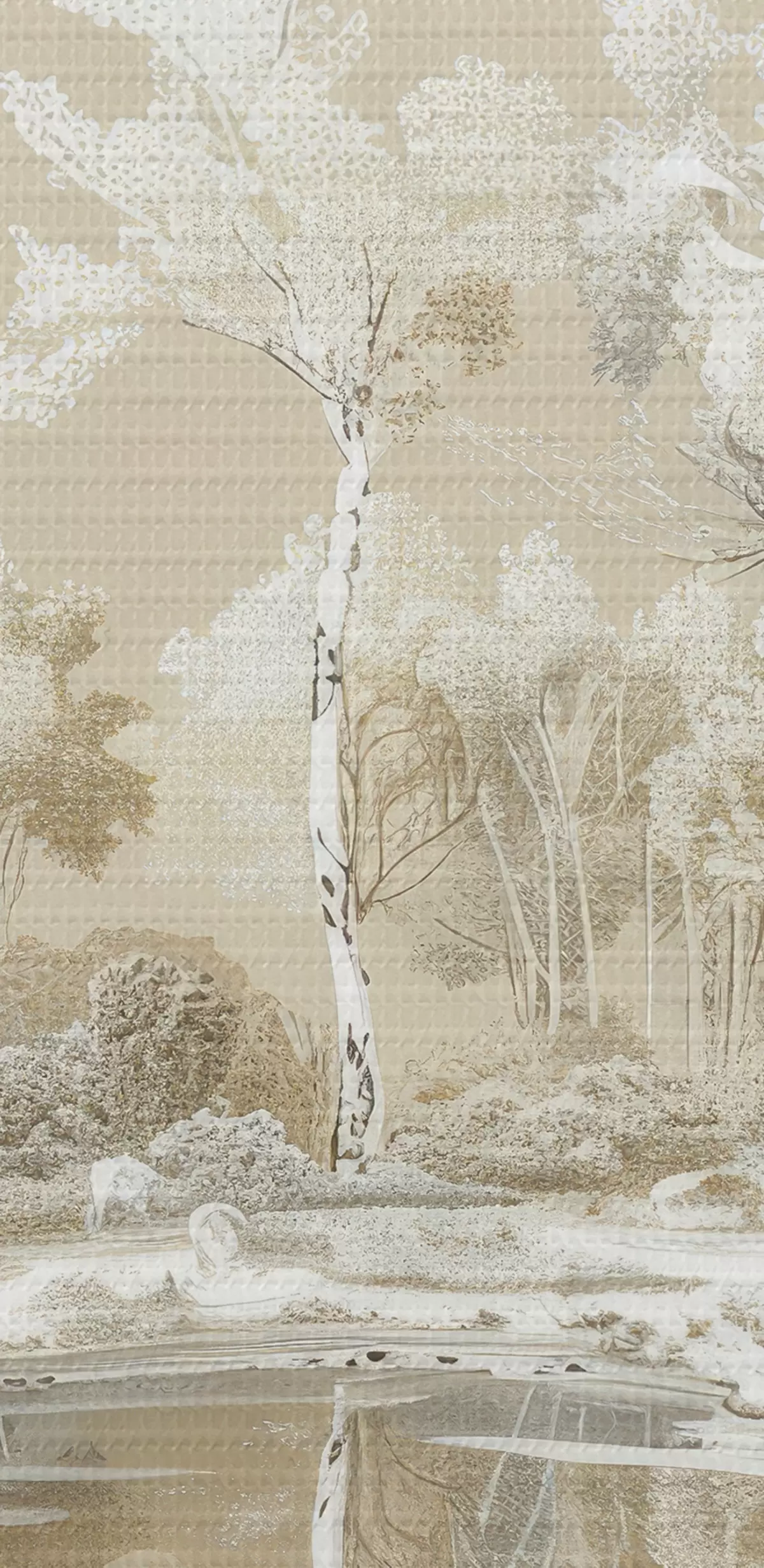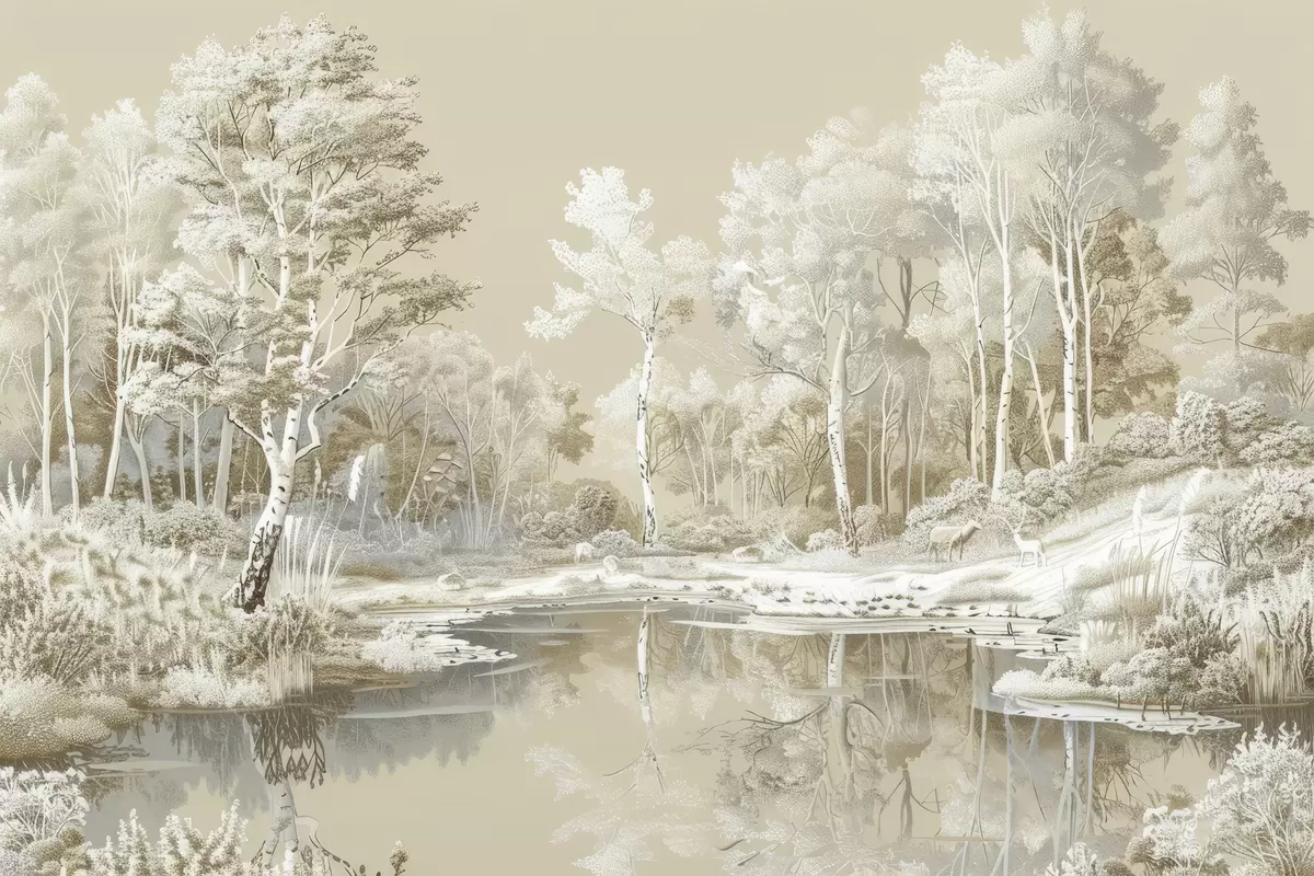 murales de pared Hermoso paisaje forestal, estanque y árboles, colores beige y blanco. s39979