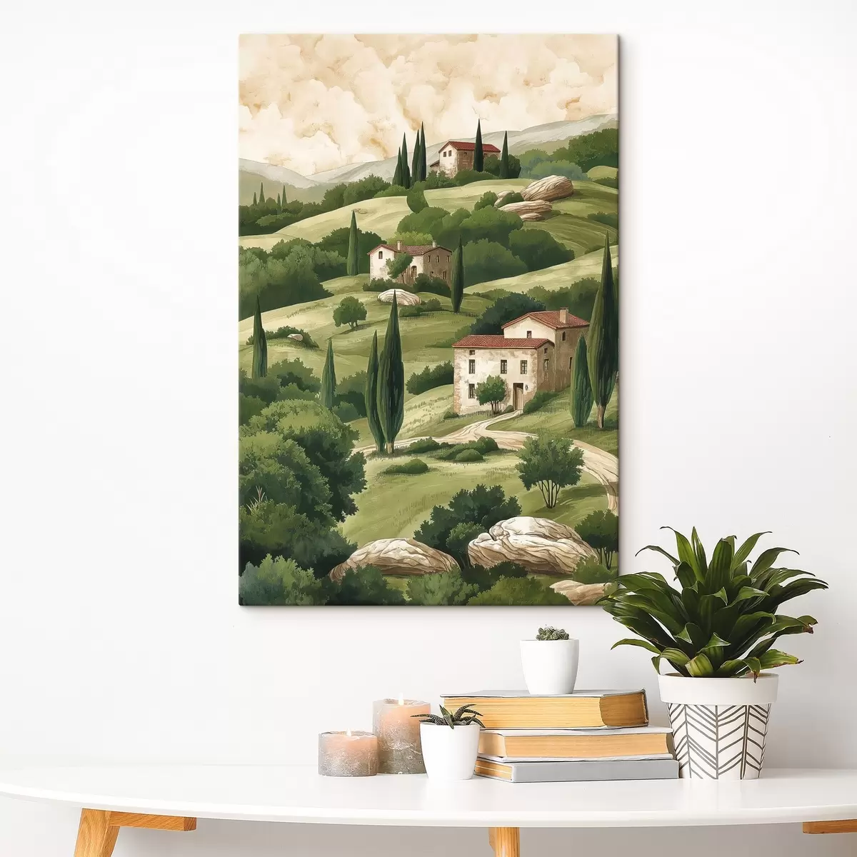Cuadros Paisaje con casas vintage, colores verde pastel, dibujo acrílico, rústico Nr s40080