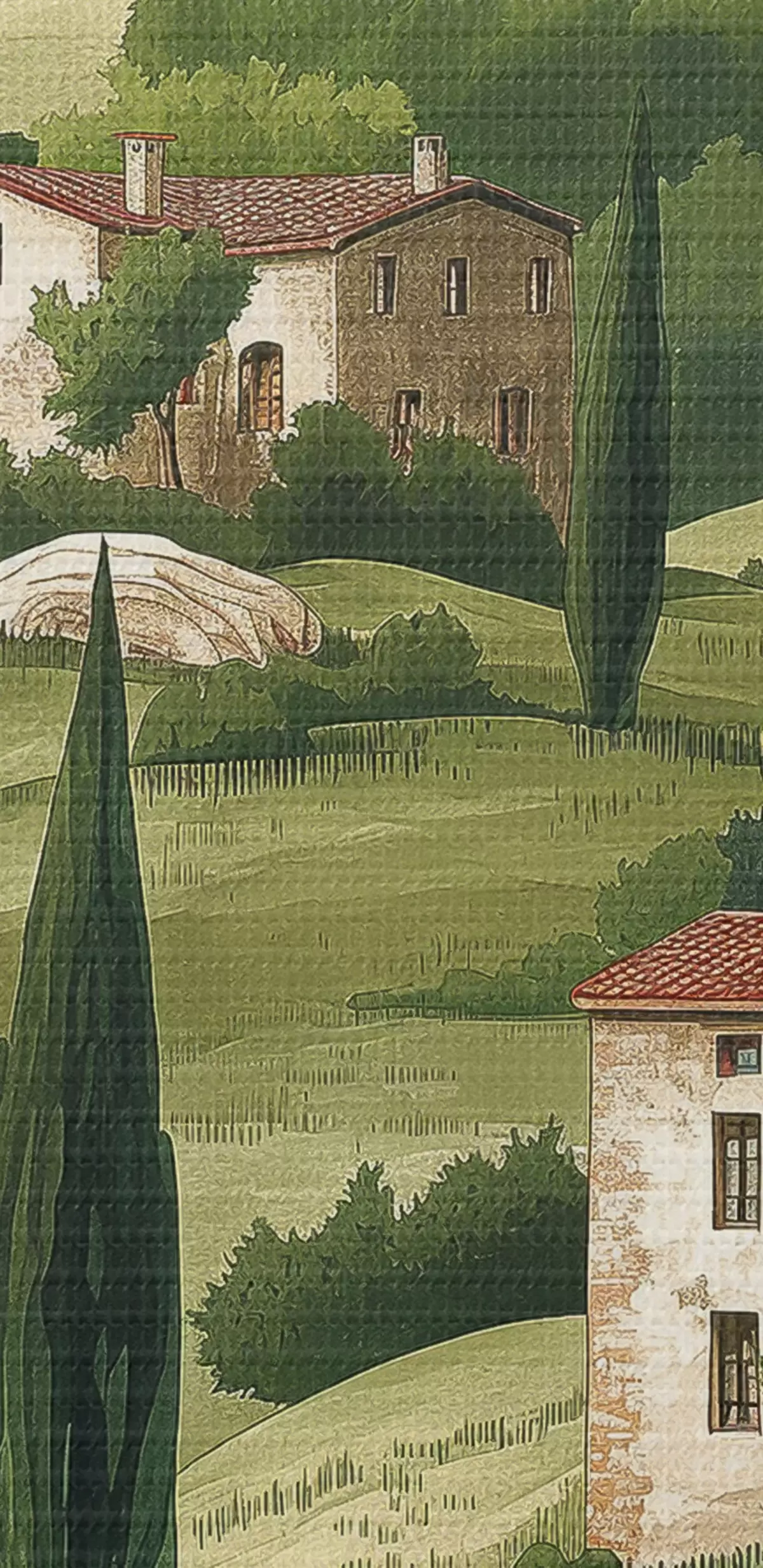 murales de pared Paisaje con casas vintage, colores verde pastel, dibujo acrílico, rústico s40080