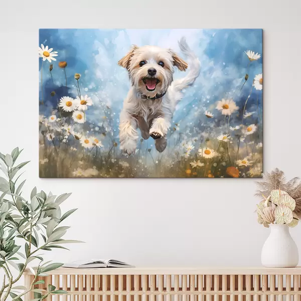 Cuadros Pequeño perro blanco saltando entre margaritas sobre un fondo azul acuarela Nr s40092