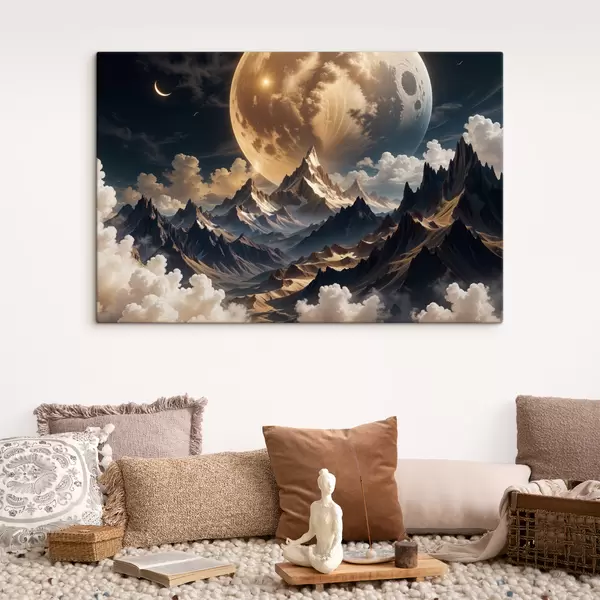 Cuadros Un paisaje surrealista con montañas cubiertas de nieve bajo una enorme luna llena, con nubes tenues. Nr s40147