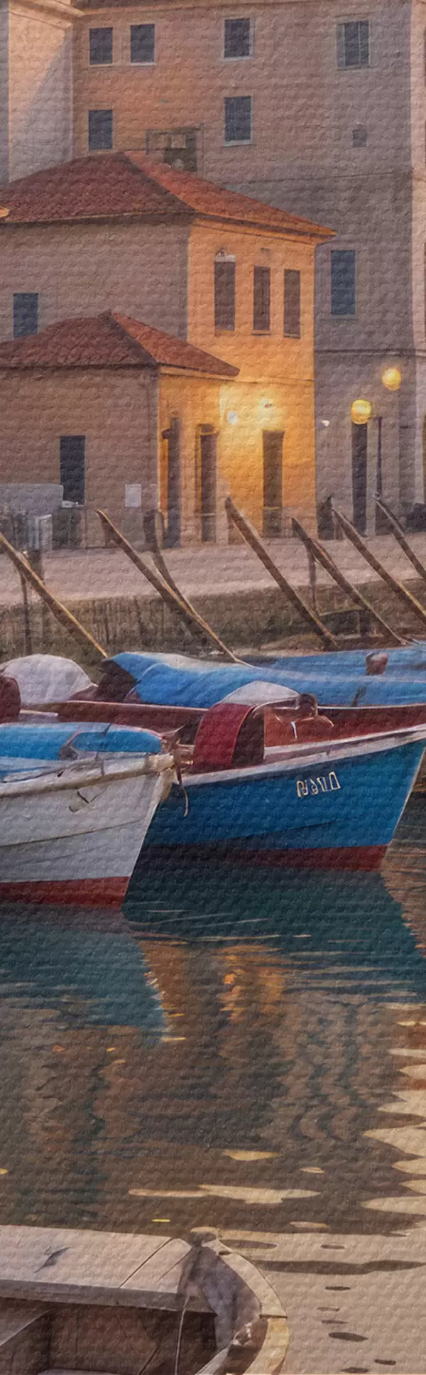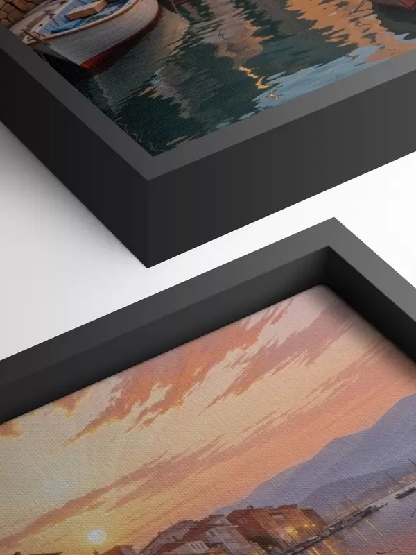 Cuadros Ciudad costera italiana al atardecer, con edificios coloridos a lo largo del paseo marítimo y barcos flotando en las tranquilas aguas. Nr s40150