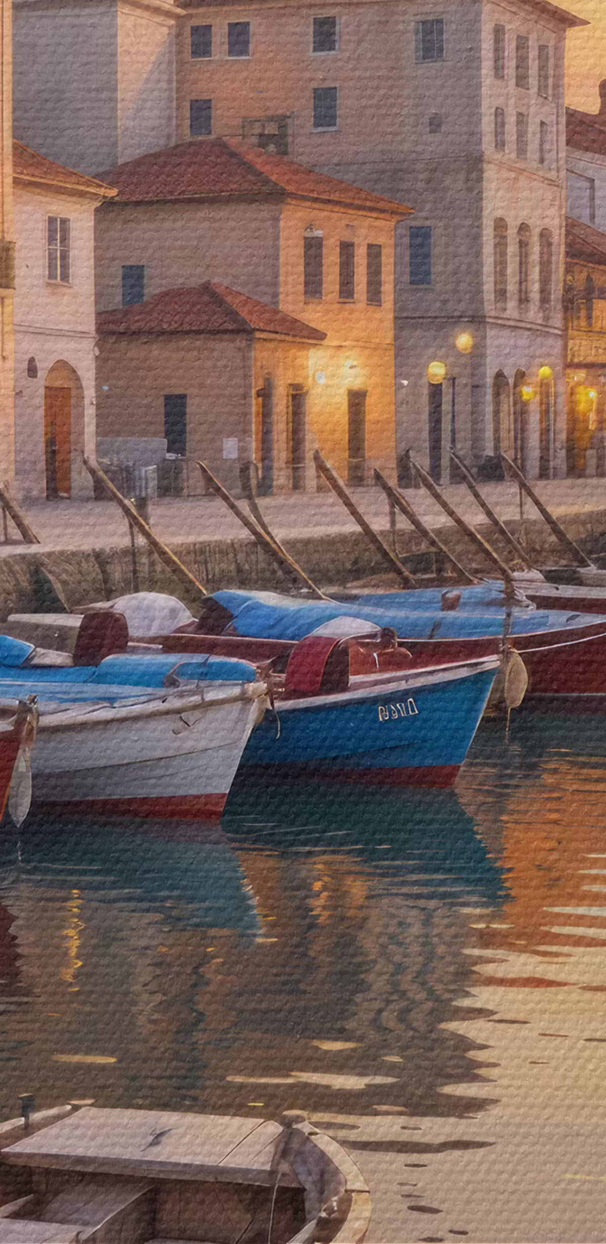 Cuadros Ciudad costera italiana al atardecer, con edificios coloridos a lo largo del paseo marítimo y barcos flotando en las tranquilas aguas. Nr s40150