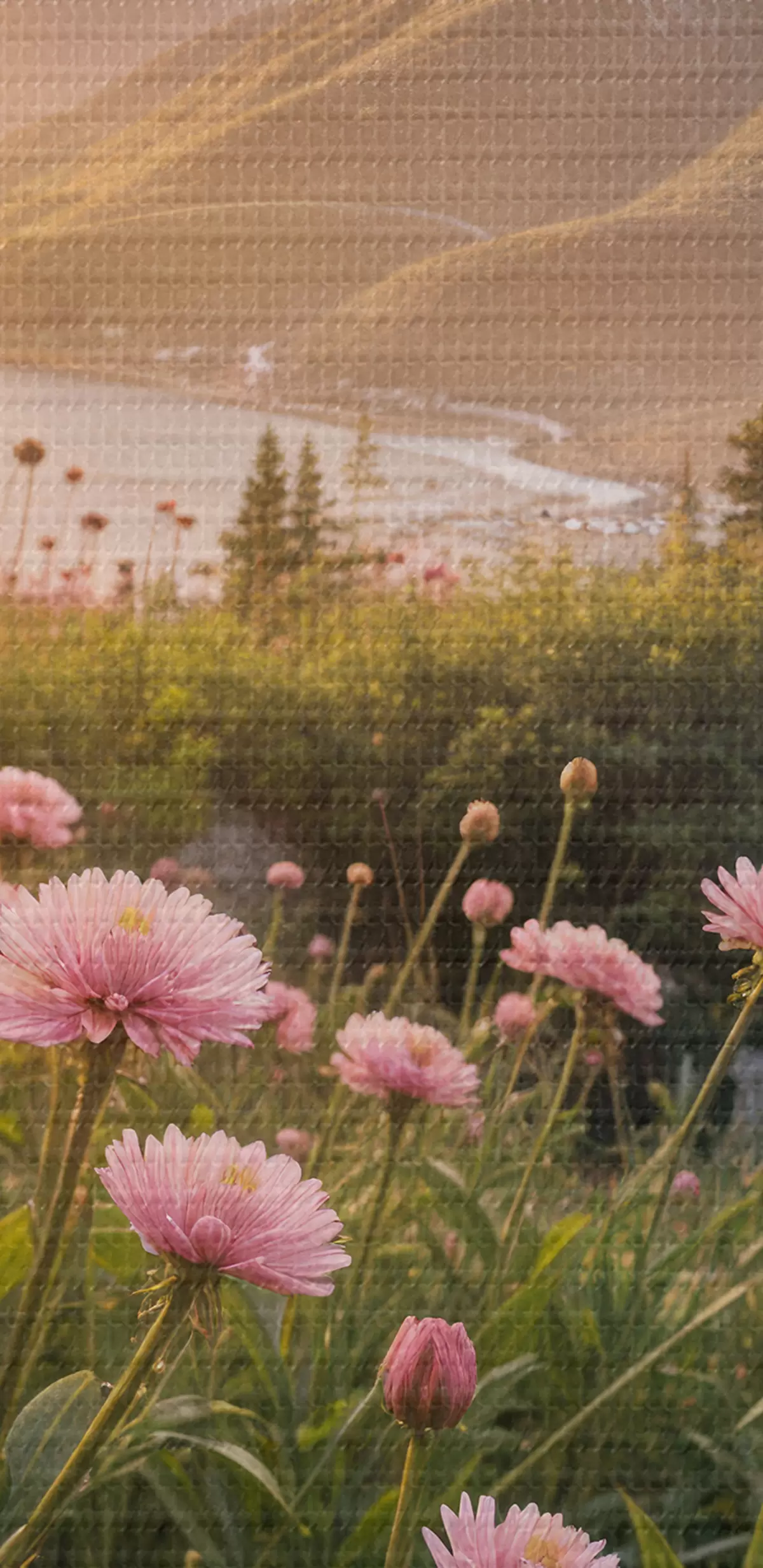 Cuadros Un campo de flores rosas parecidas a margaritas en primer plano, con una gran cadena montañosa al fondo. Nr s40154