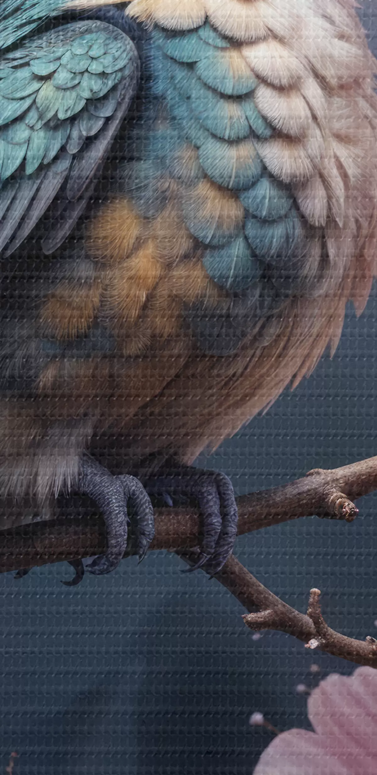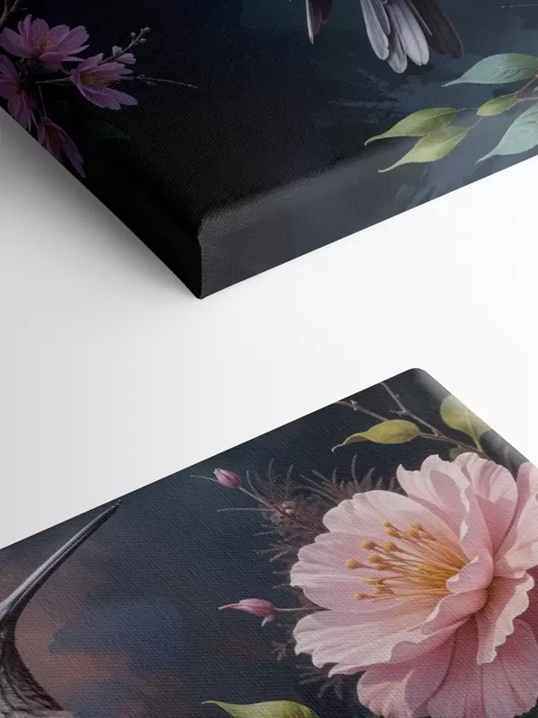 Cuadros Un colibrí colorido posado en una rama con flores rosas vibrantes en el fondo Nr s40155