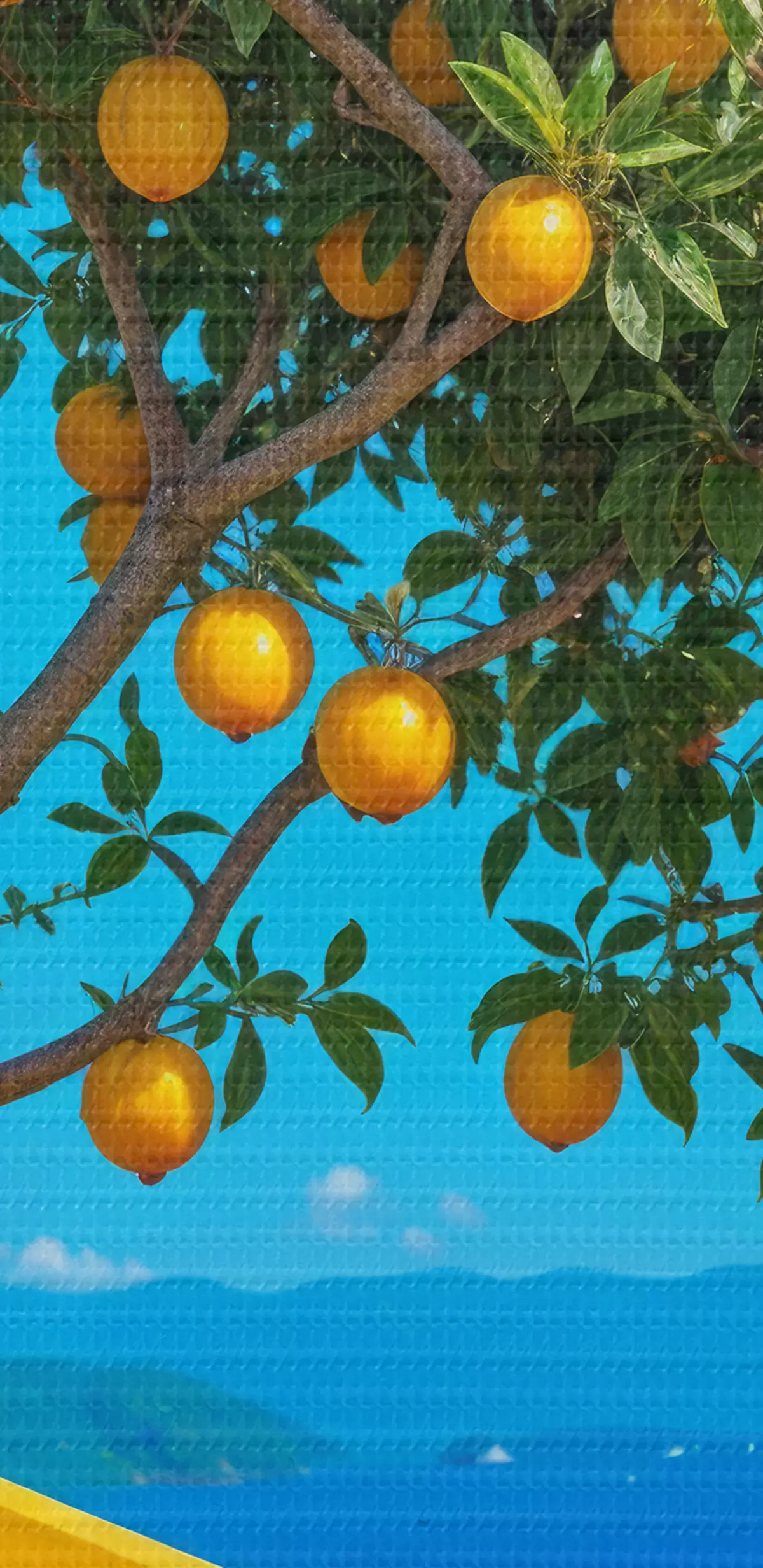 Cuadros Un naranjo con frutos maduros que crece en un edificio con una pared azul y un techo de tejas con vista al océano. Nr s40159