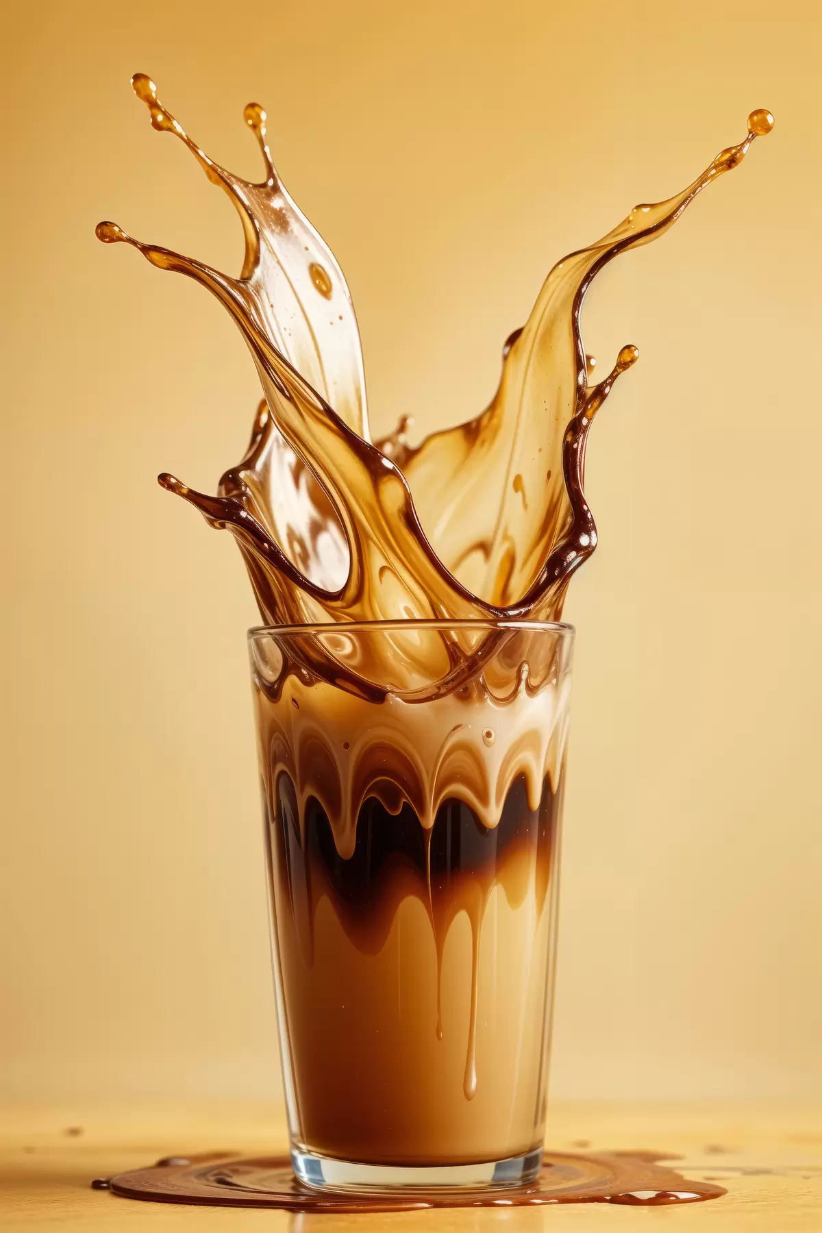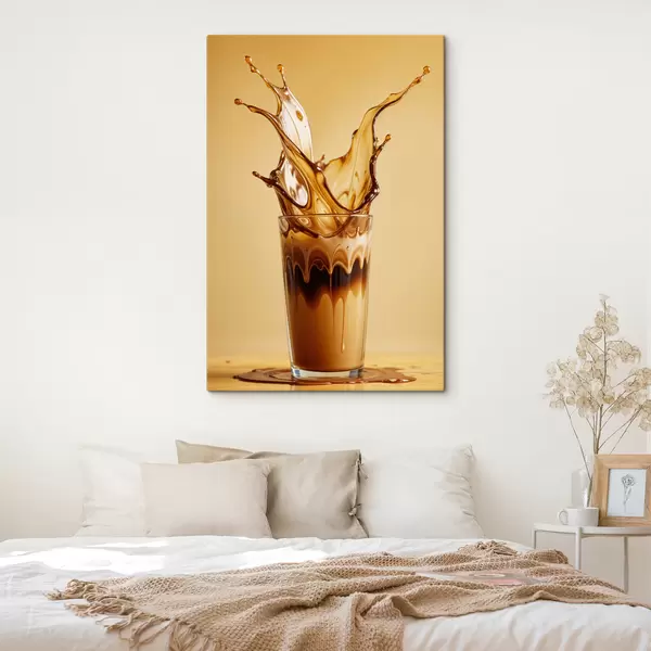 Cuadros Un vaso lleno de café con un efecto de salpicadura dramático que crea una imagen abstracta y dinámica. Nr s40165