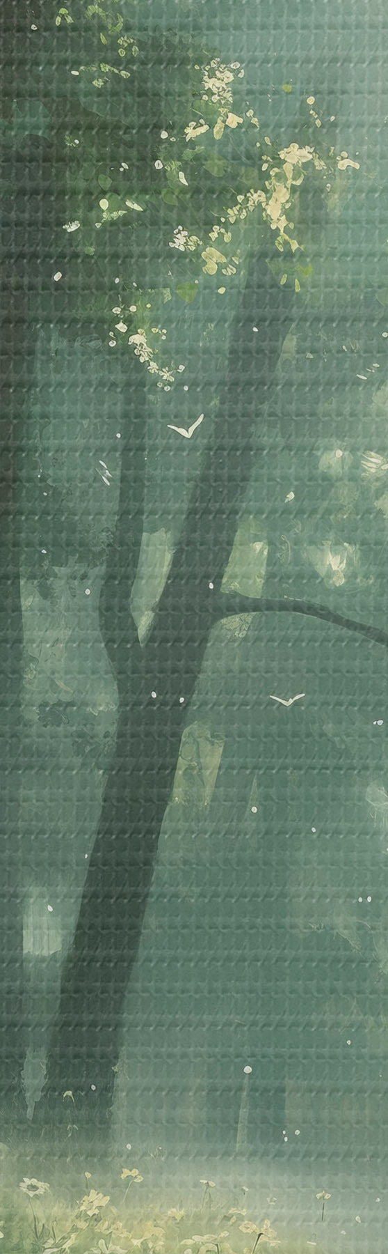 Cuadros Bosque denso con luz solar en los árboles, flores de manzanilla, hierba verde, naturaleza. Nr s40224